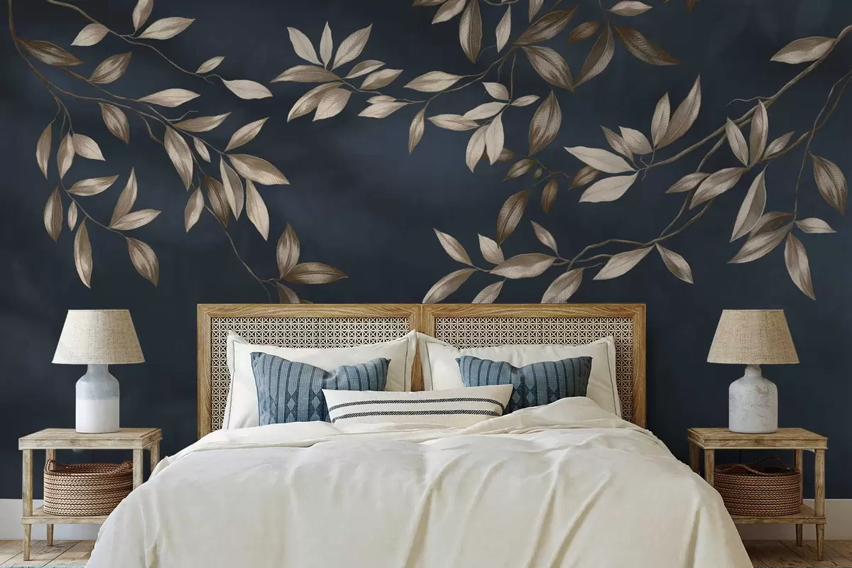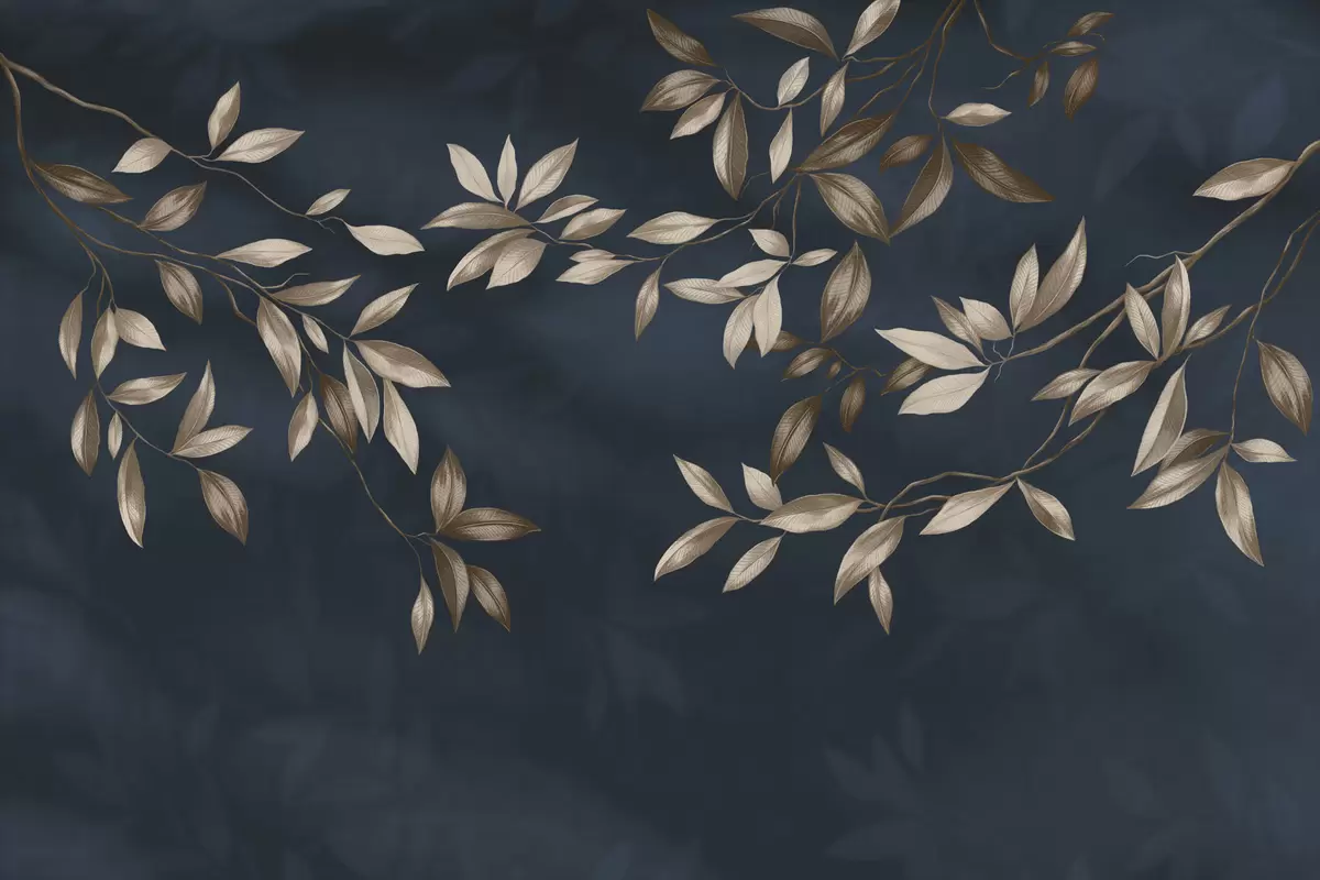 Fotobehang Decoratieve bladrijke takken op een diepblauwe achtergrond N° w05113v1