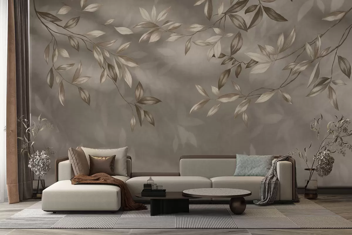 Fotobehang Delicate bladrijke takken in beigetinten op een lichte achtergrond N° w05113v2