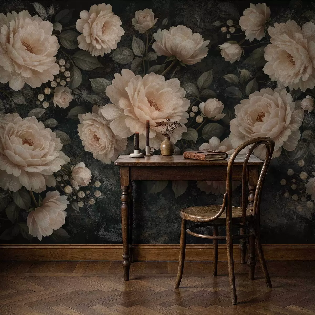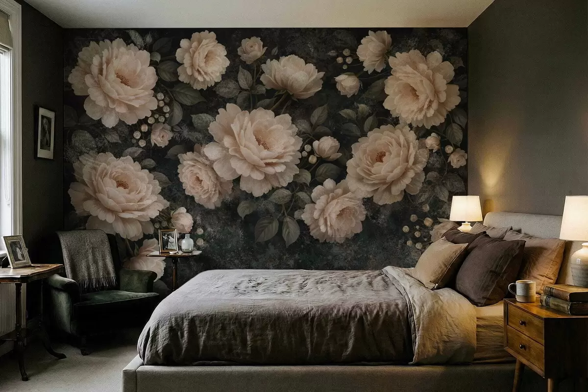 Fotobehang Volumineuze bloemen in beige tinten op een donkere achtergrond N° w05114
