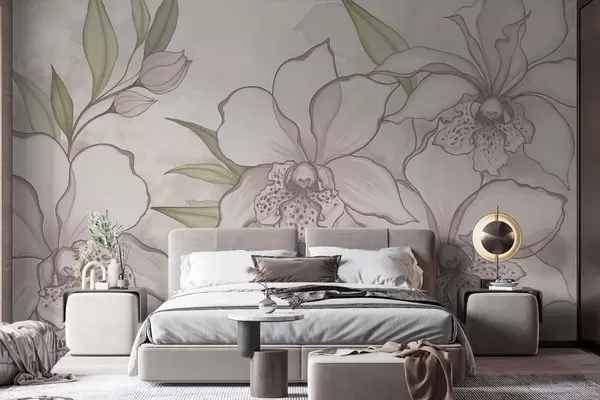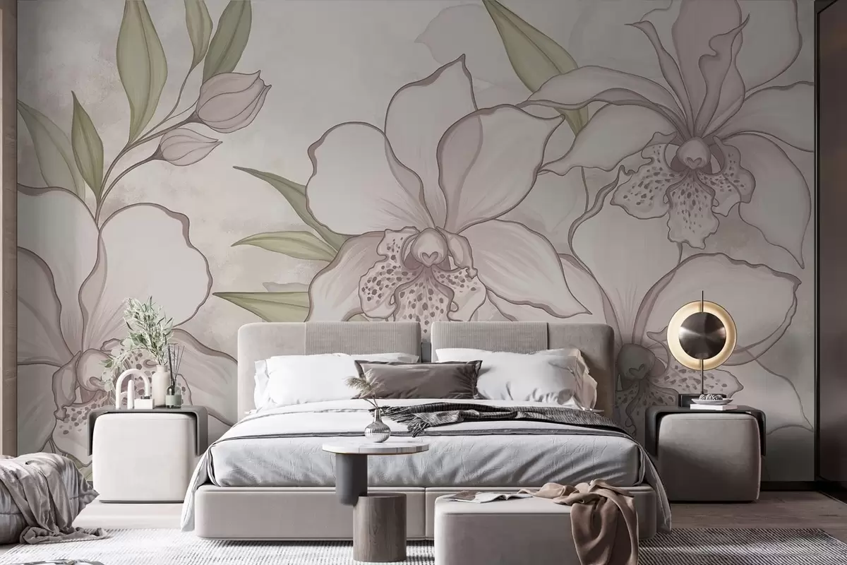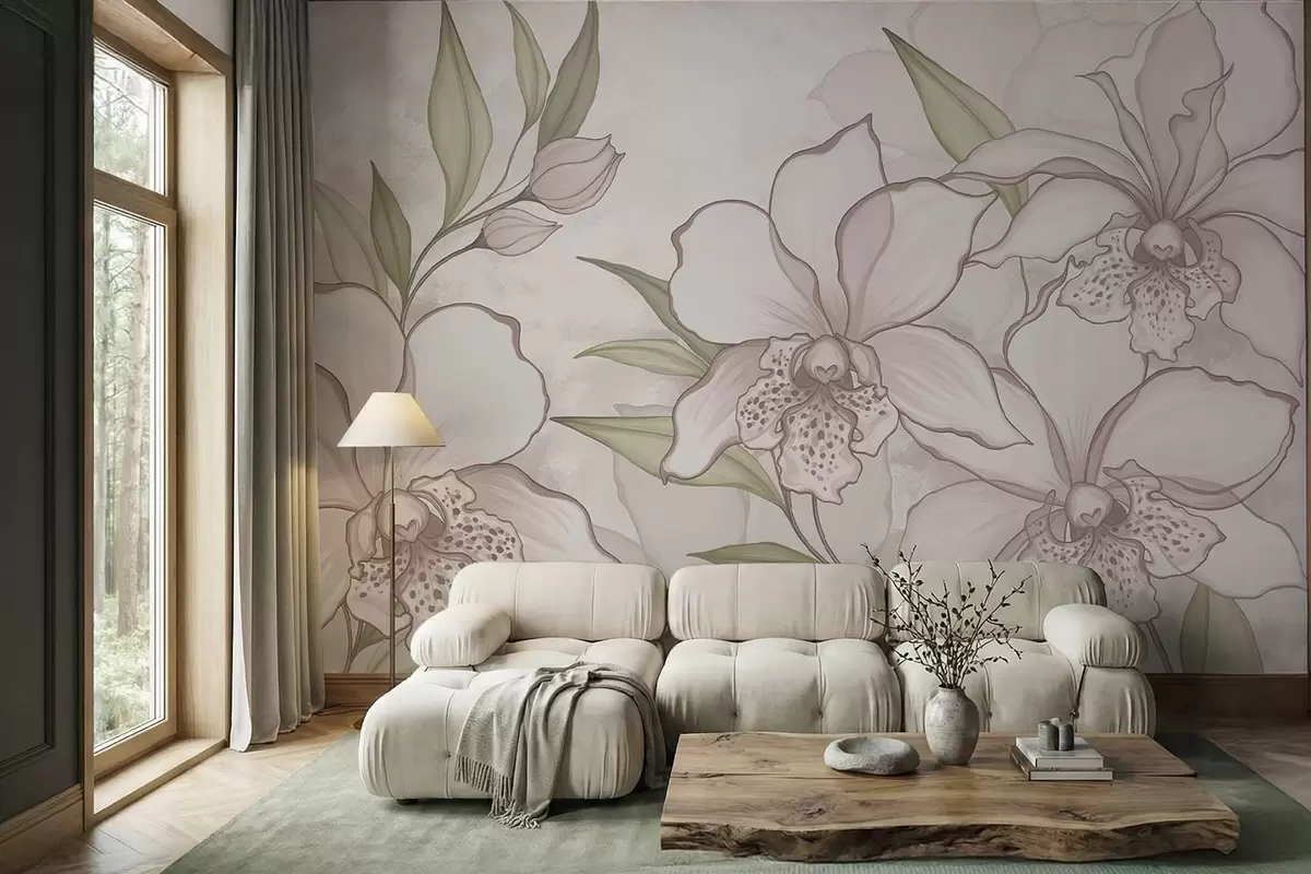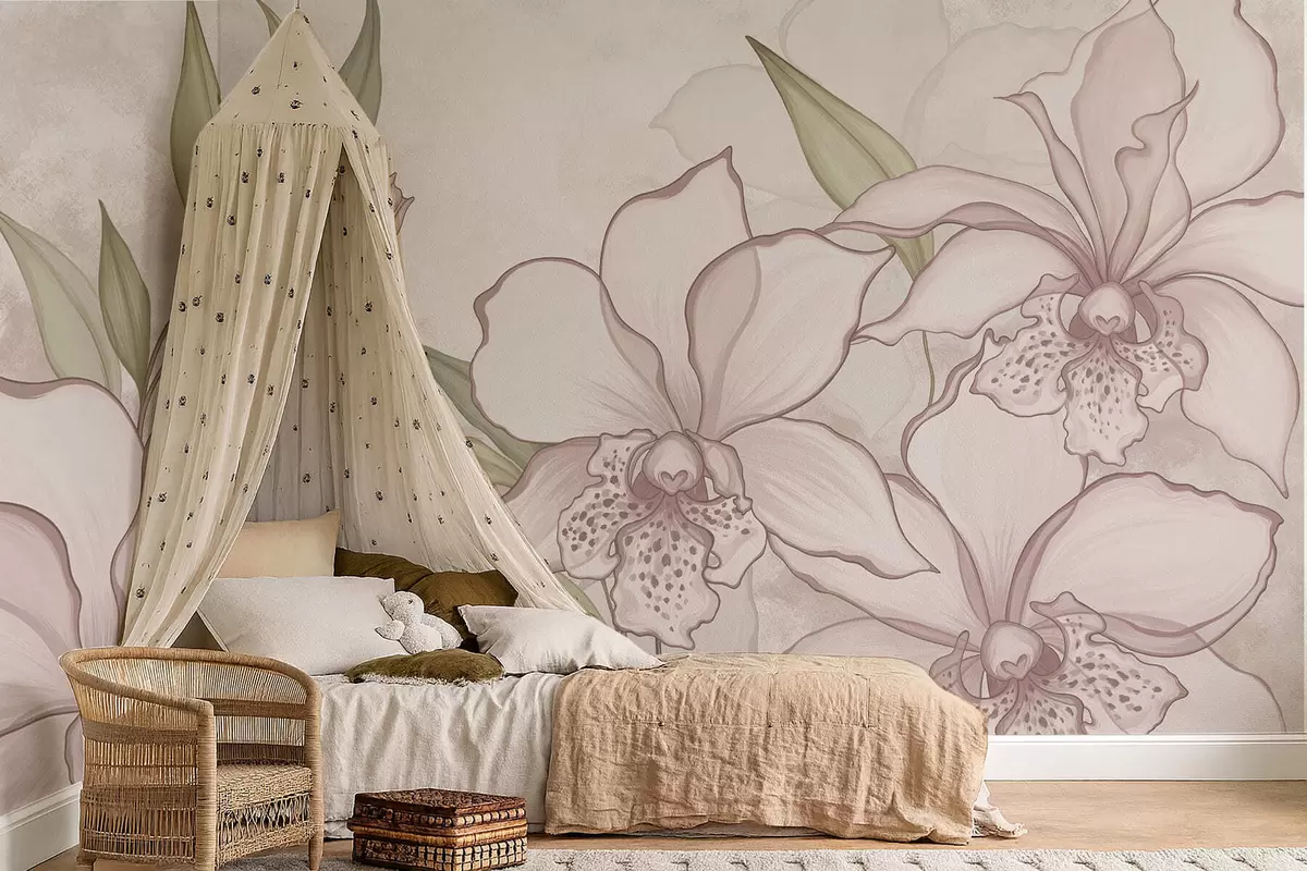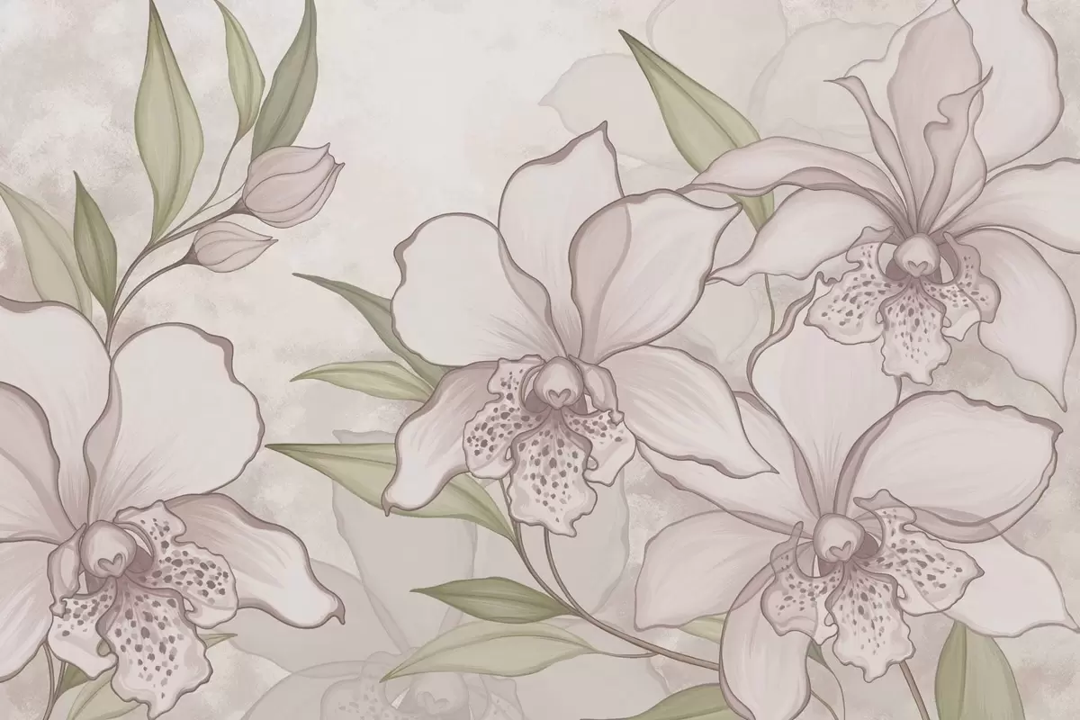 Fotobehang Illustratie van bleke orchideeën met bladeren op een beige achtergrond N° w05117