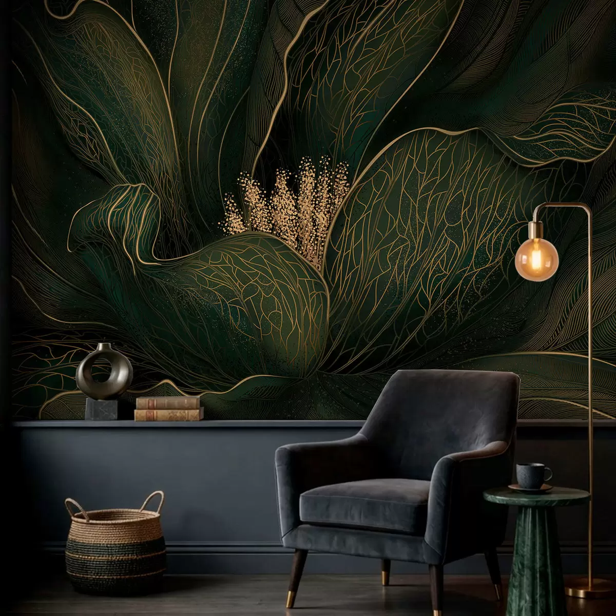 Fotobehang Donkergroene abstracte bloem met fijne lijndetails N° w05119v1