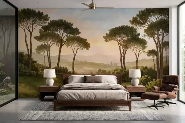 Fotobehang Landschap met bomen in het warme licht van de zonsondergang N° w05122