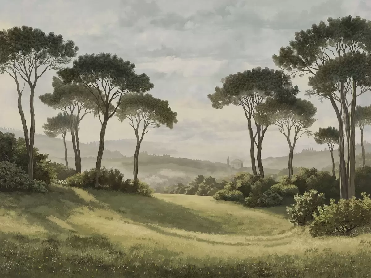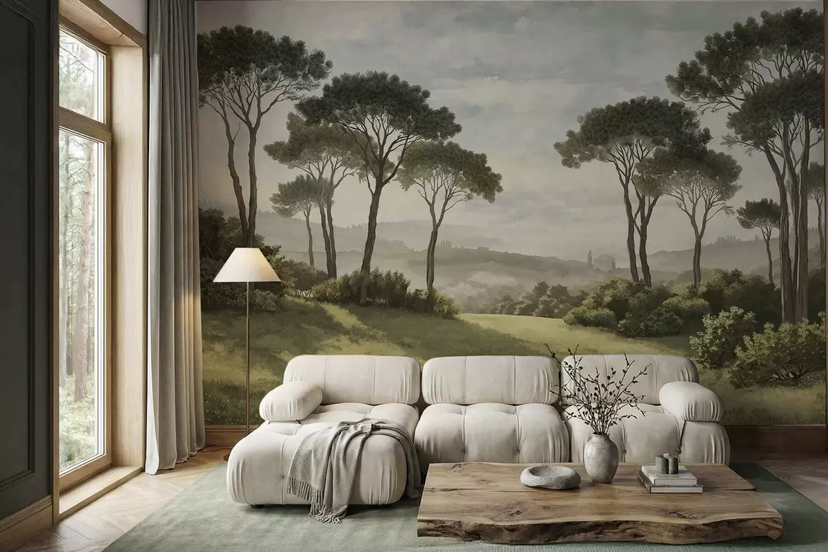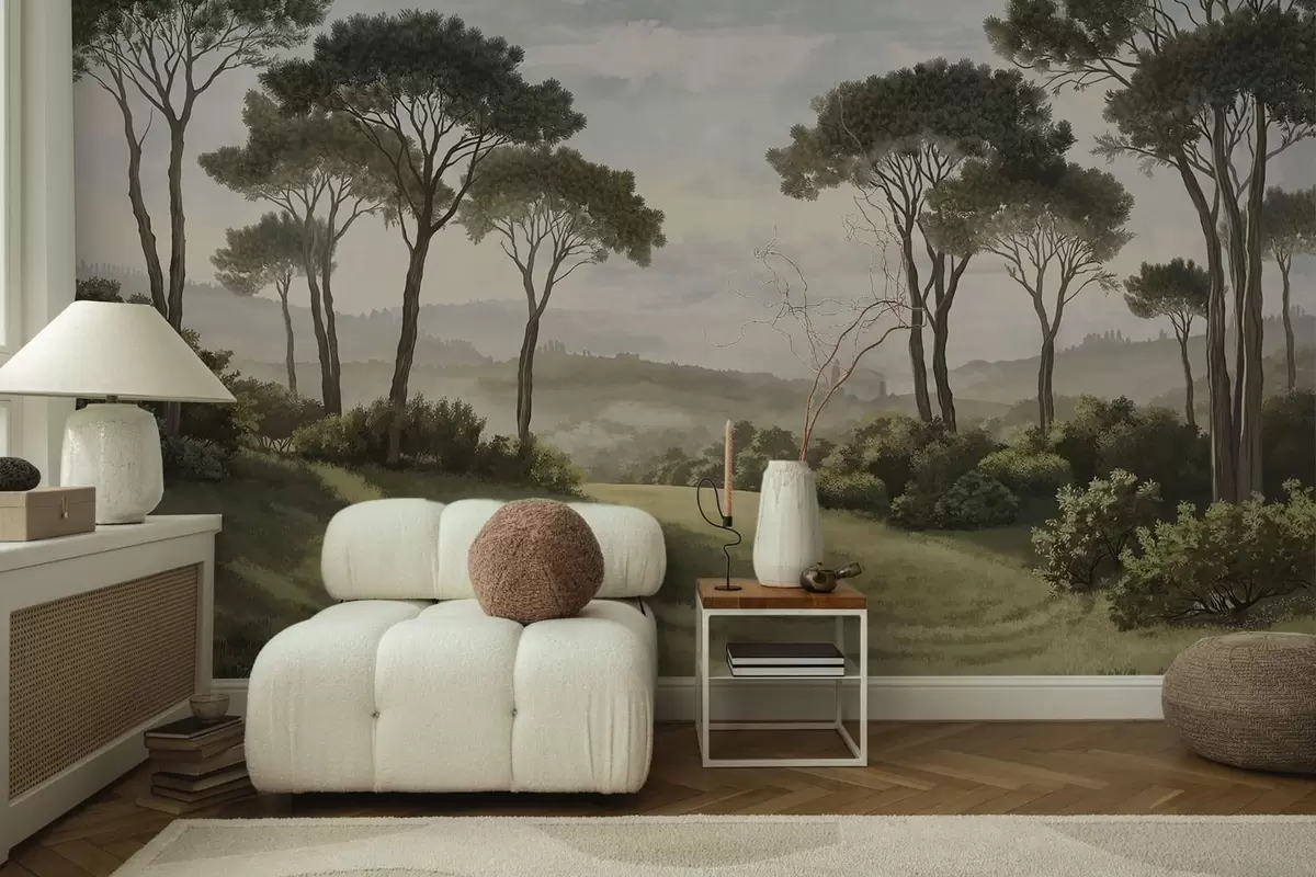 Fotobehang Landschap met bomen, een weide en mist in de verte N° w05122v1