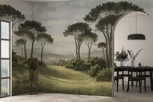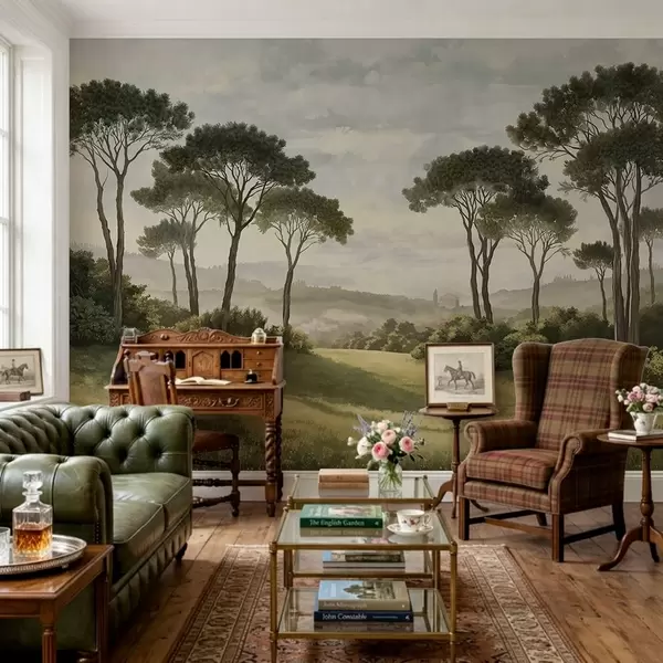 Fotobehang Landschap met bomen, een weide en mist in de verte N° w05122v1
