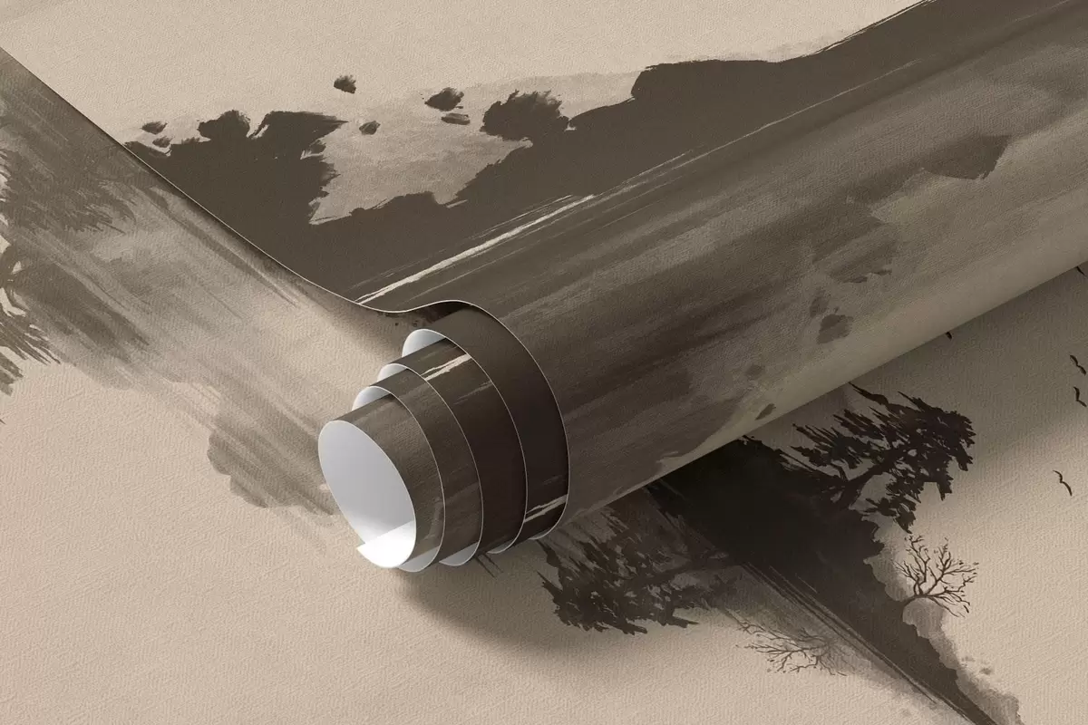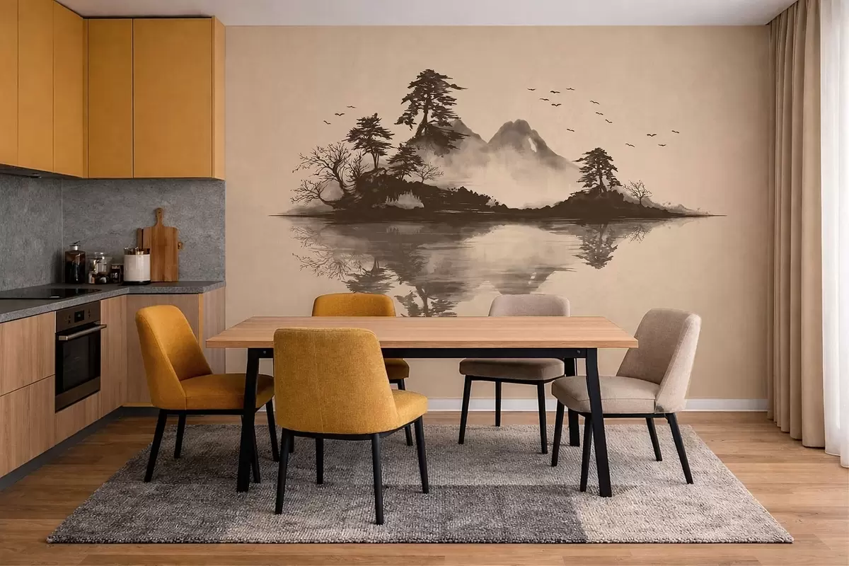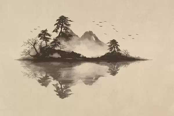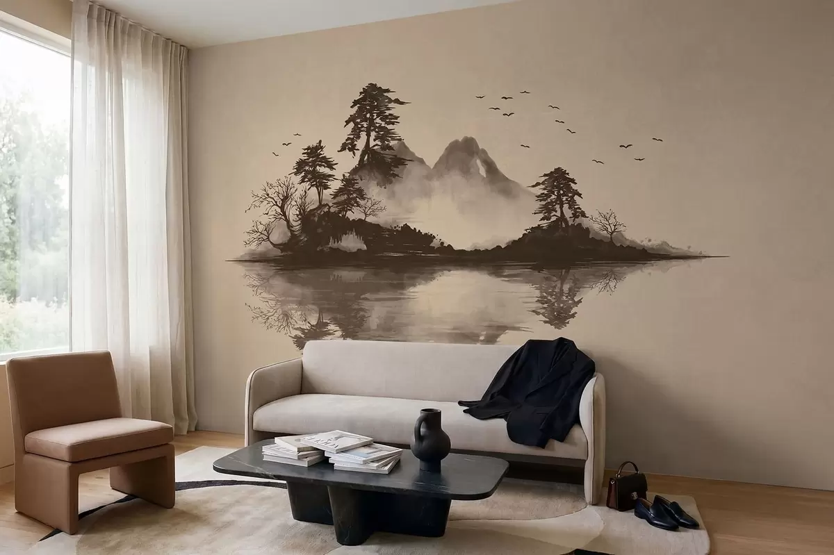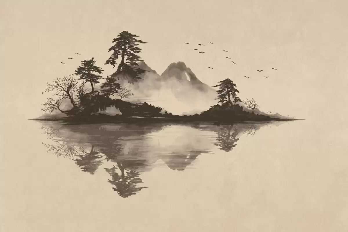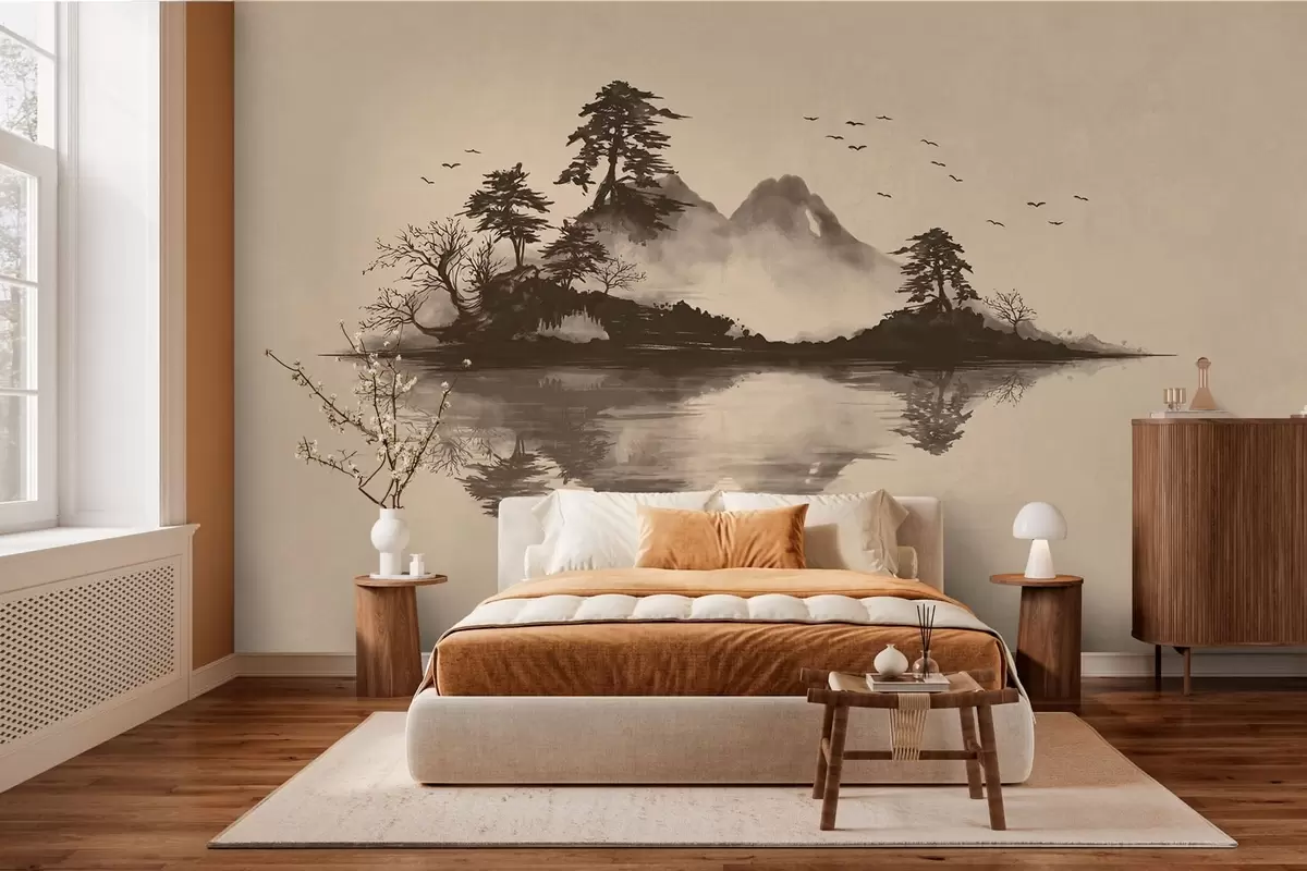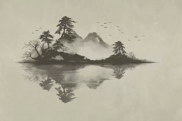 Fotobehang Sumi-e-berglandschap met dennenbomen en weerspiegeling N° w05124