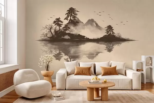 Fotobehang Sumi-e-berglandschap met dennenbomen en weerspiegeling N° w05124