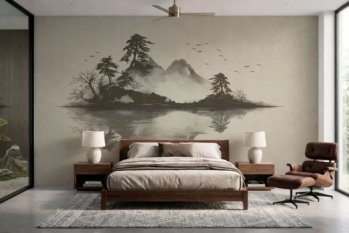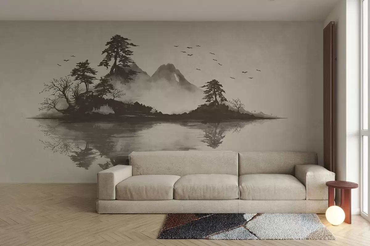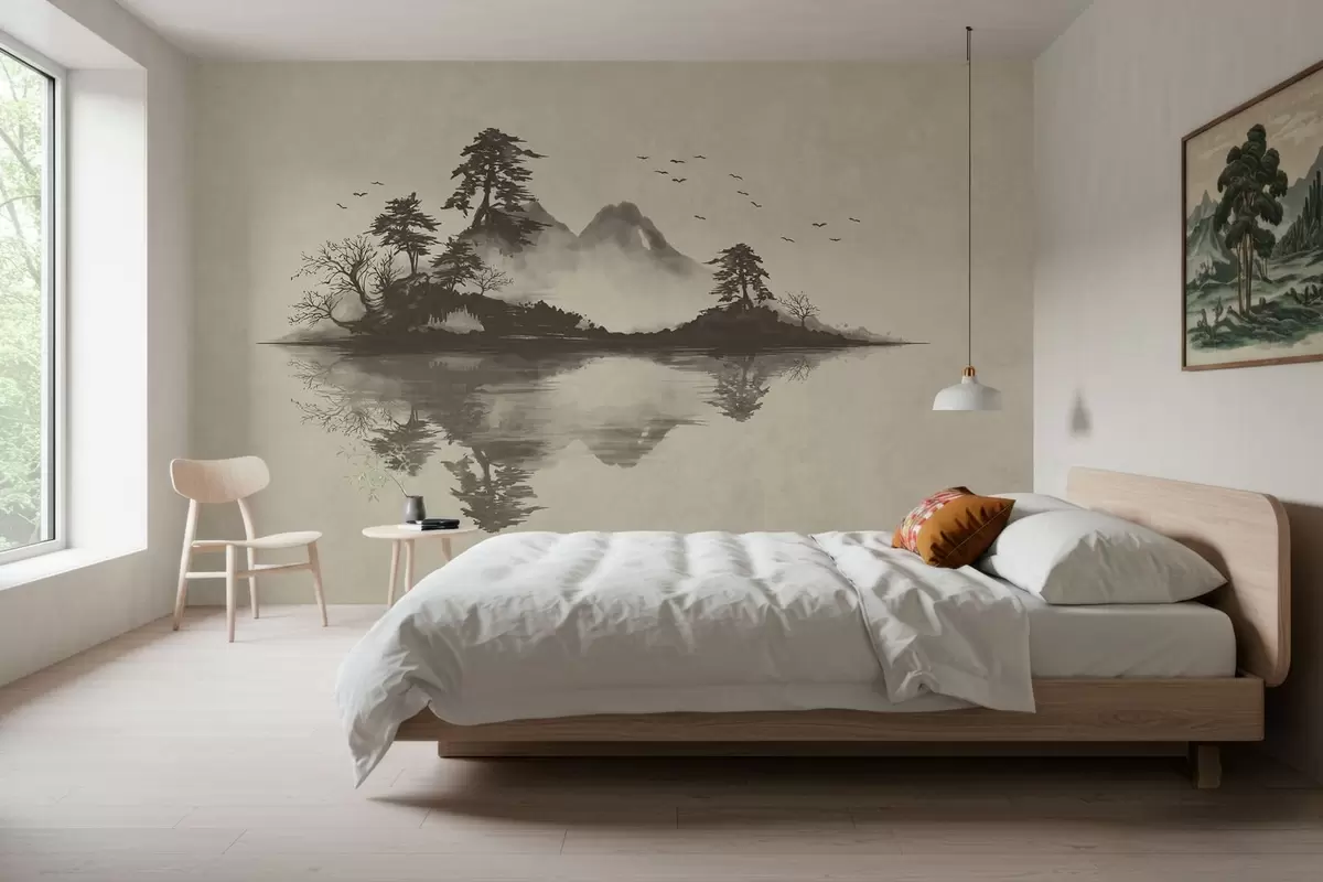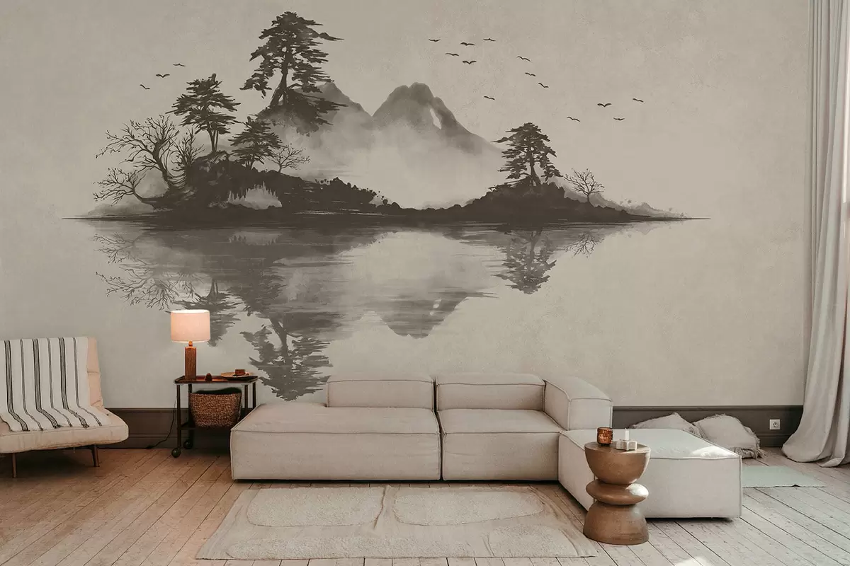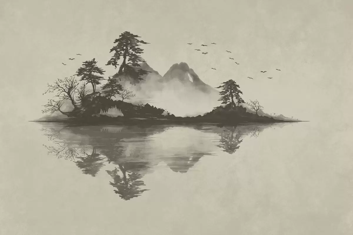 Fotobehang Sumi-e-berglandschap in zachte grijstinten N° w05124v1