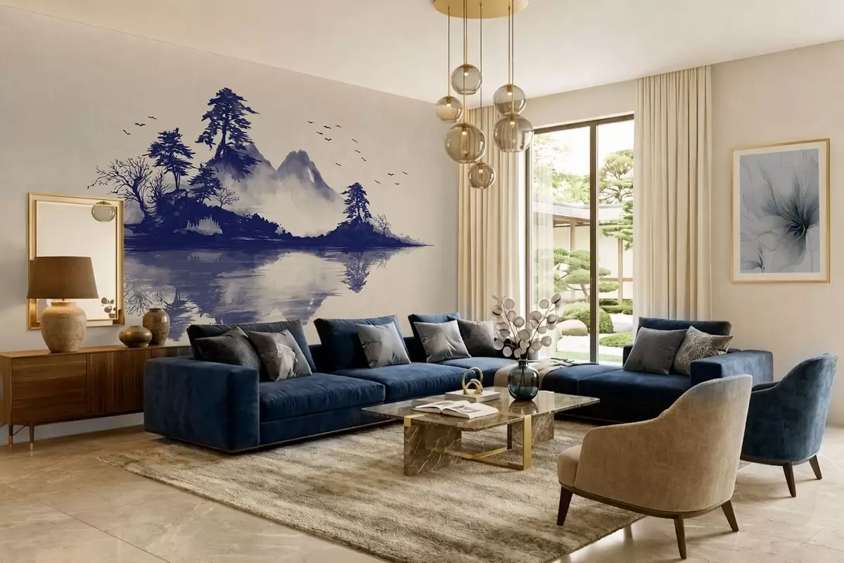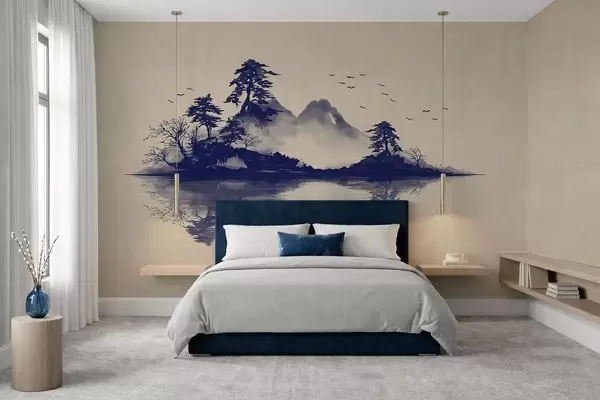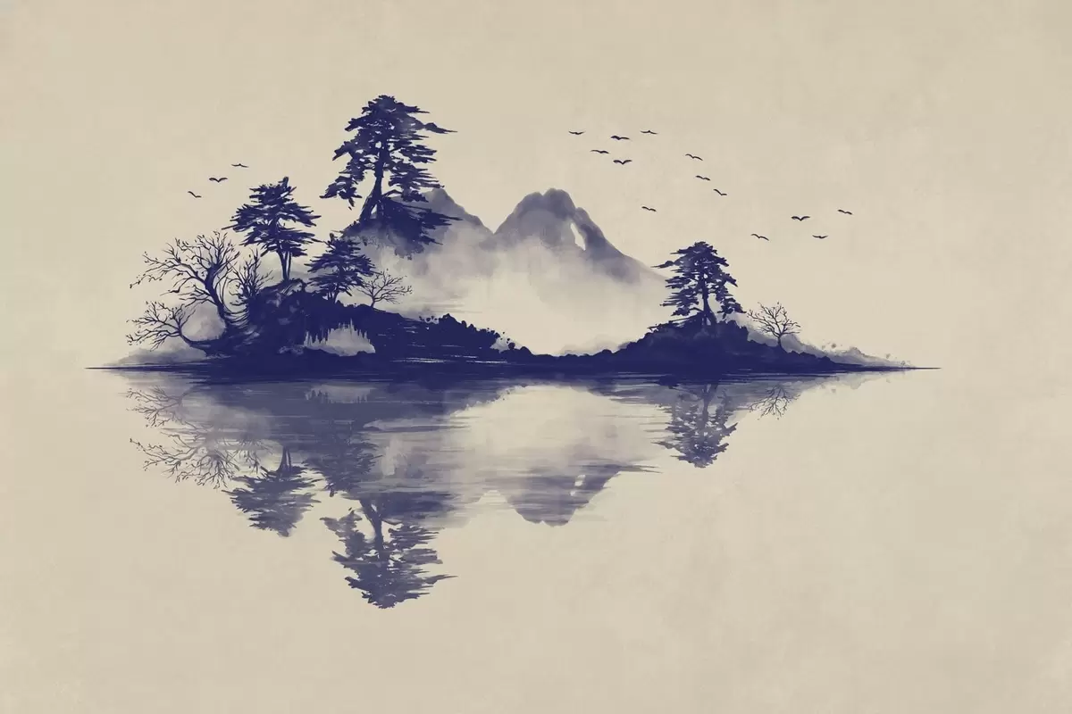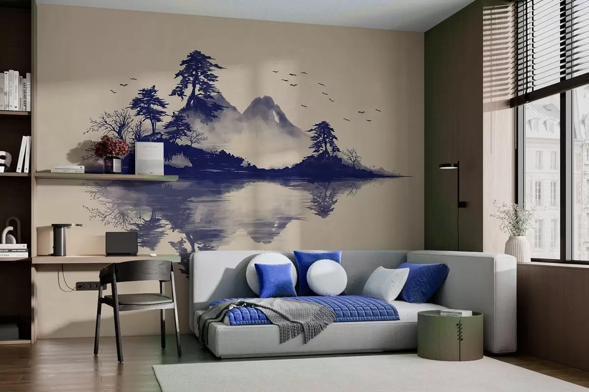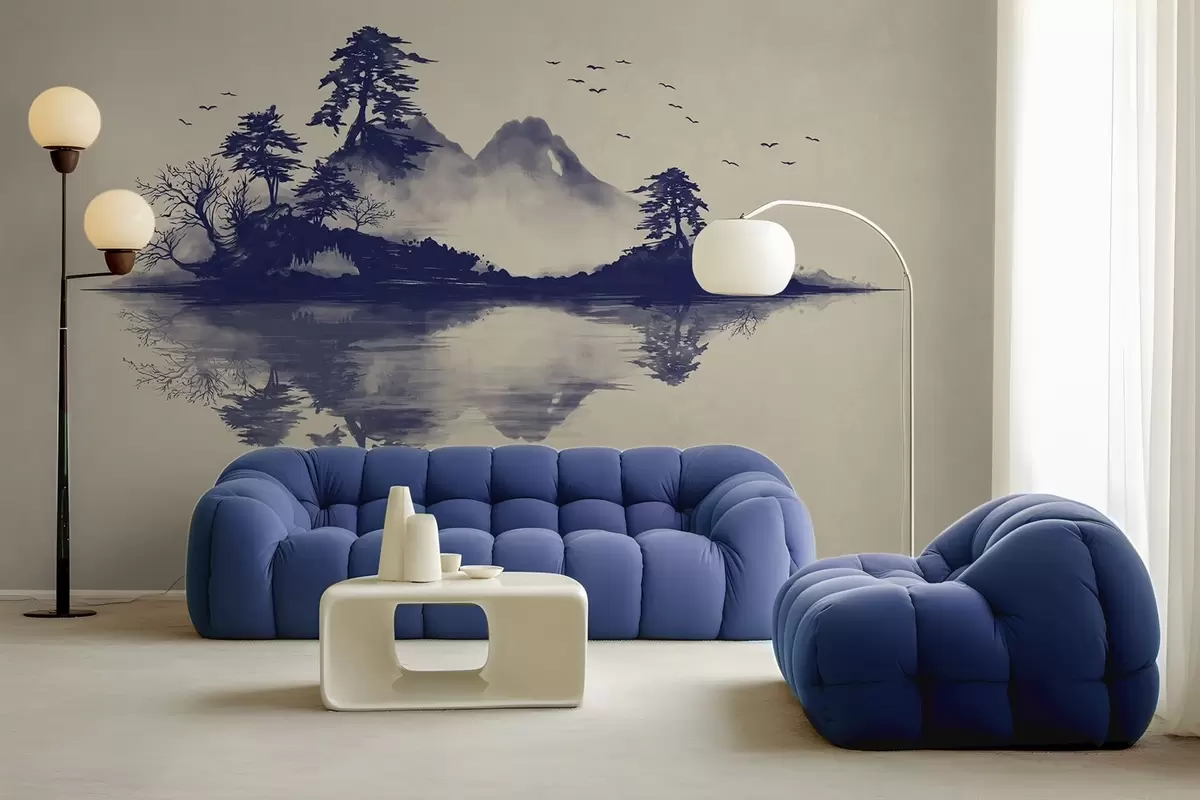 Fotobehang Sumi-e-berglandschap in blauwtinten N° w05124v2