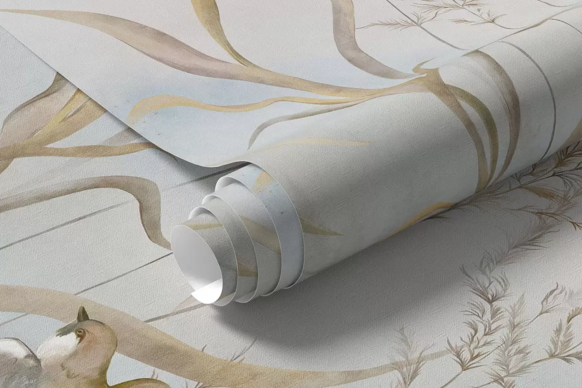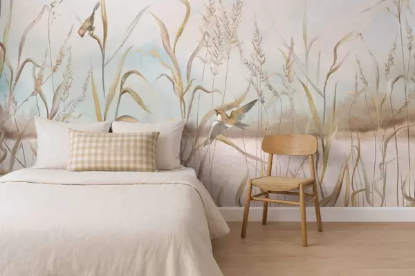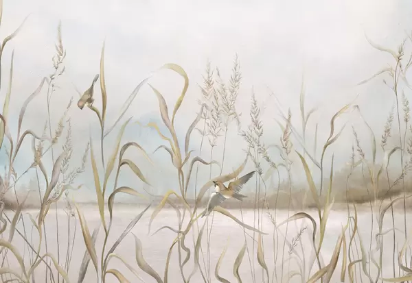 Fotobehang Illustratie van riet en vogels aan het water in zachte tinten N° w05125