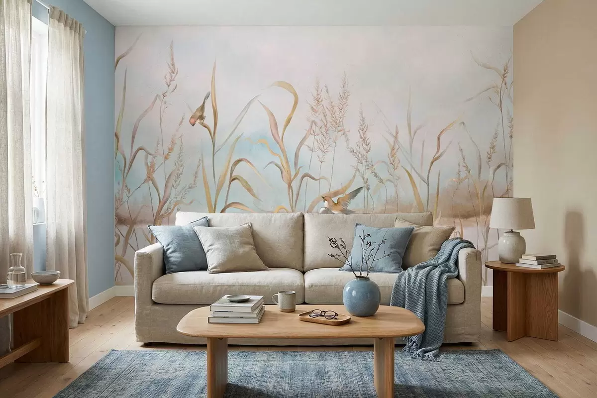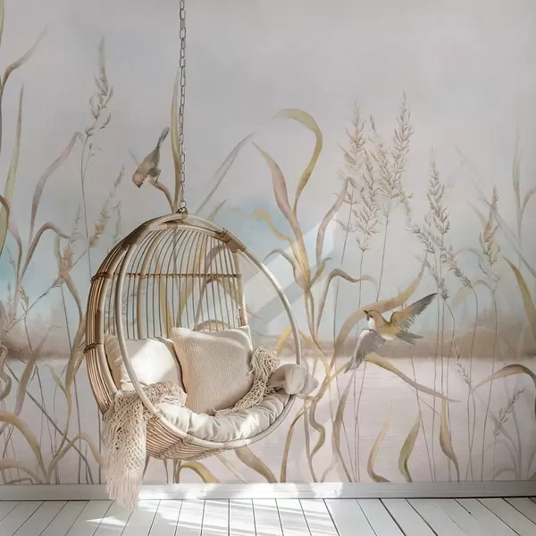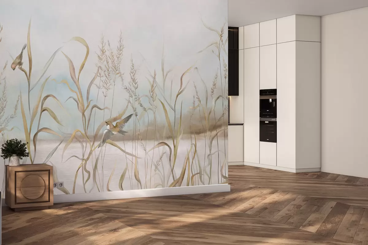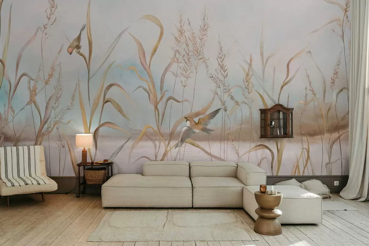Fotobehang Illustratie van riet en vogels aan het water in zachte tinten N° w05125