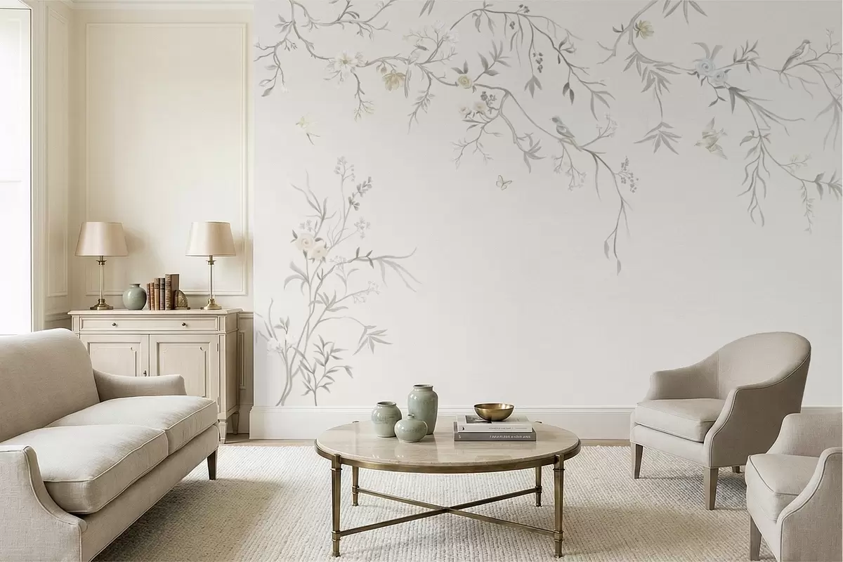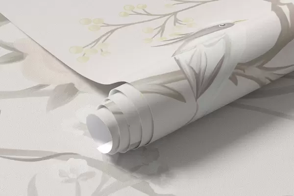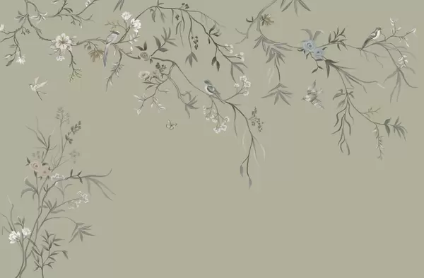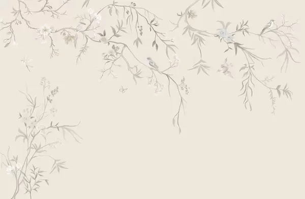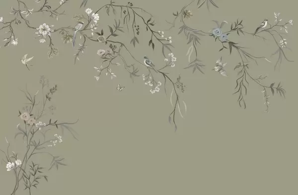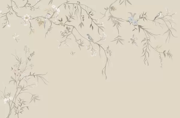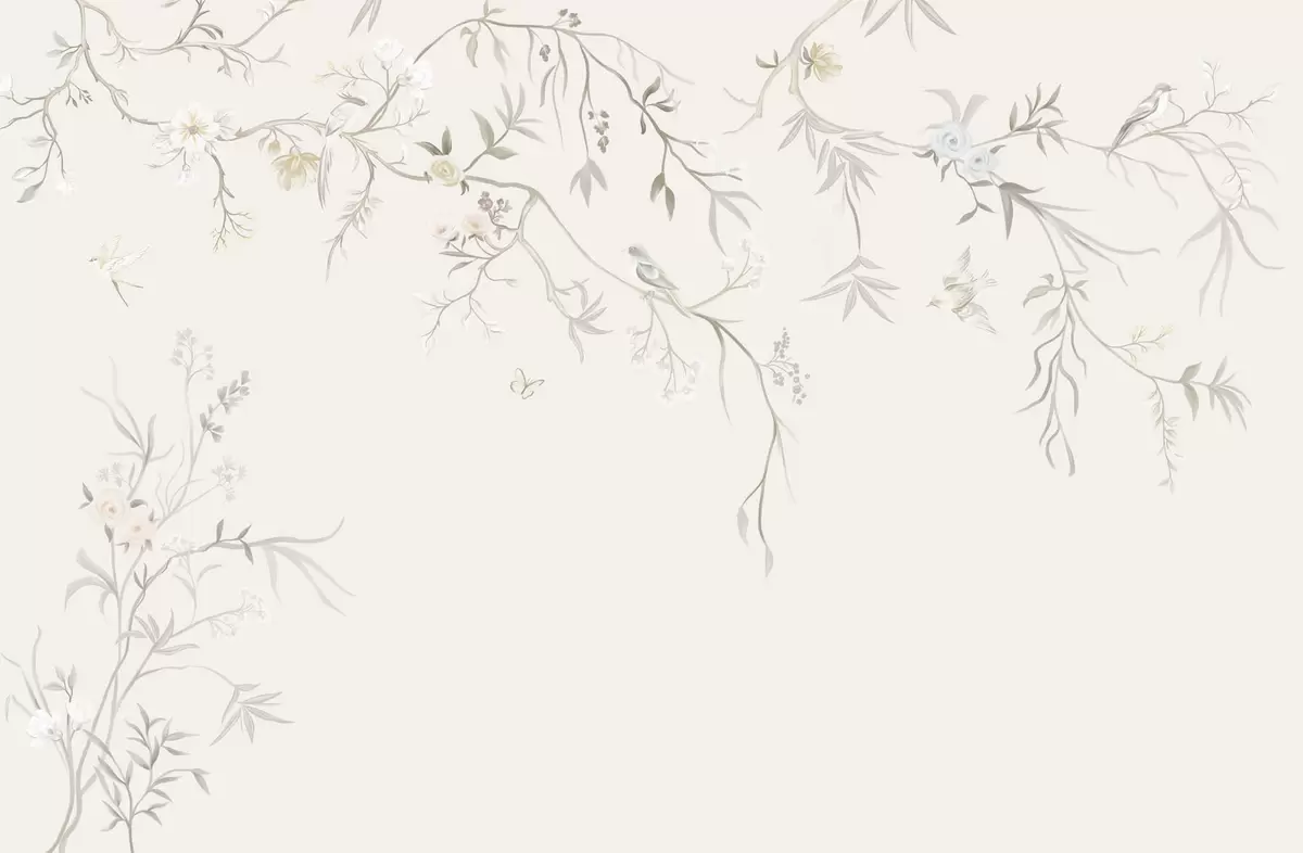 Fotobehang Delicate bloemen en vogels op een krijtkleurige achtergrond N° w05127