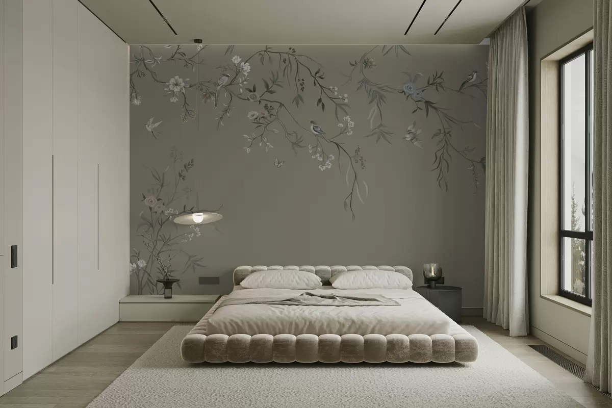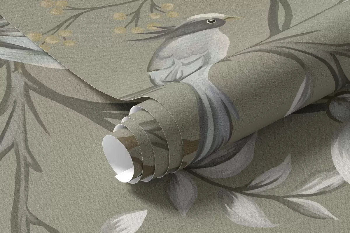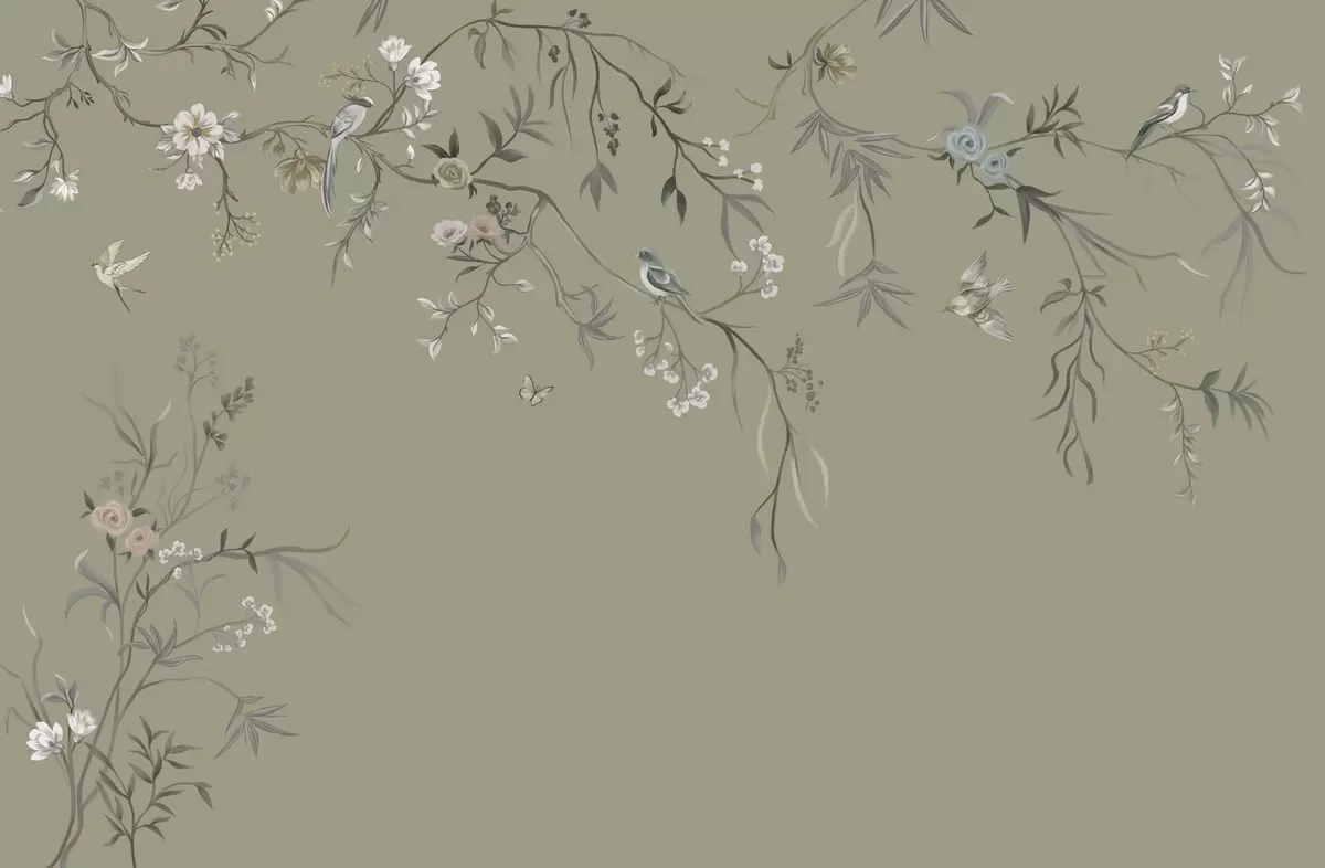 Fotobehang Bloemmotief met vogels op grijze achtergrond N° w05127v4