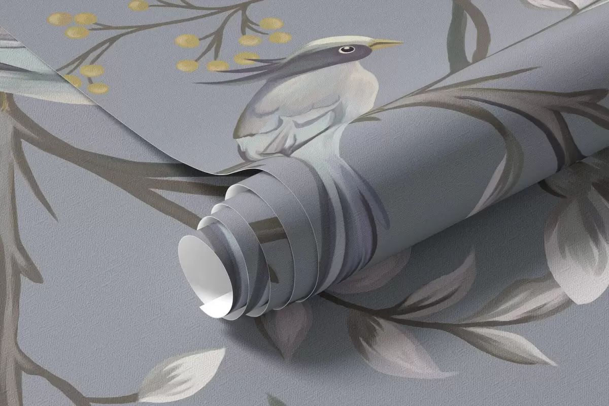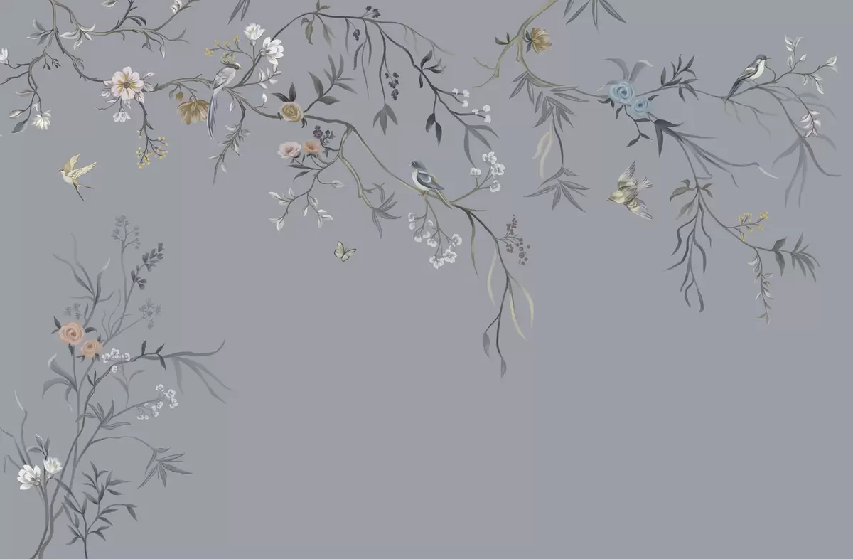 Fotobehang Bloemtakken met vogels op groenachtige achtergrond N° w05127v5
