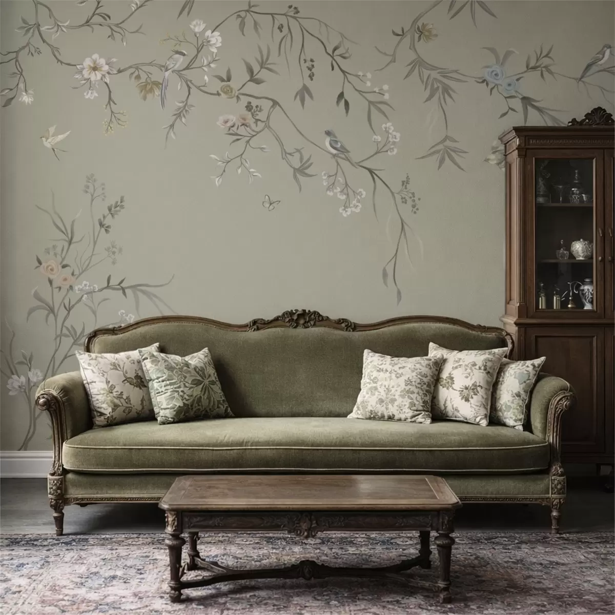 Fotobehang Bloemenpatroon met vogels op een koele achtergrond N° w05127v6