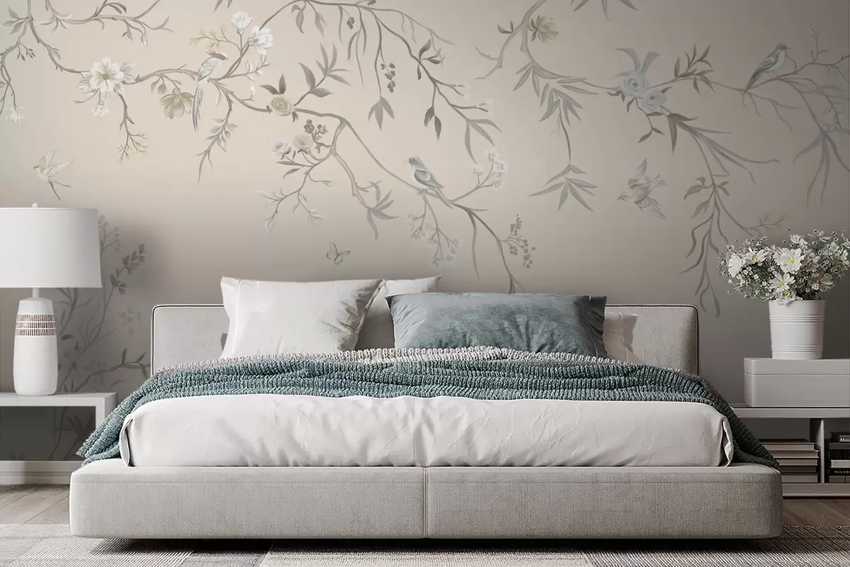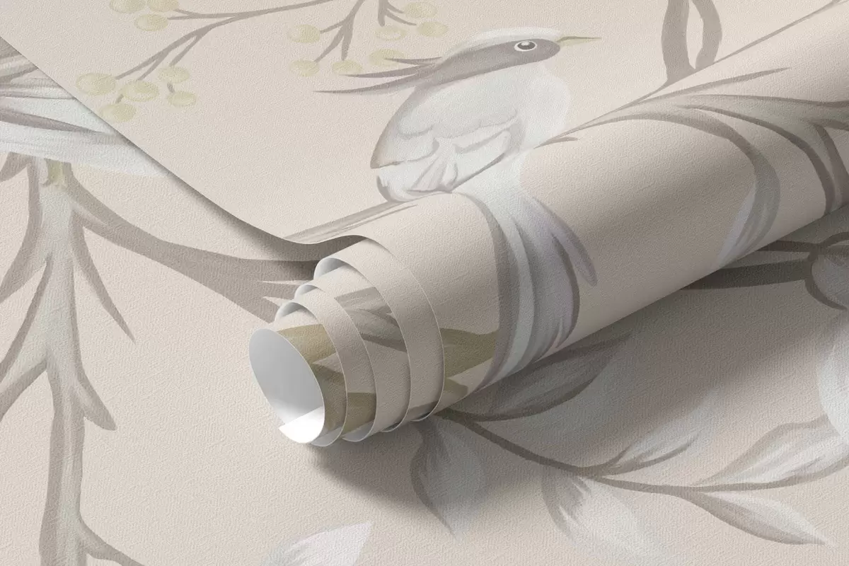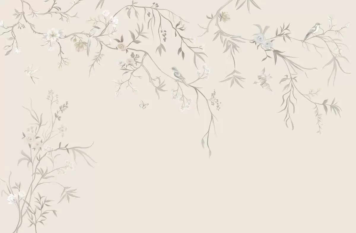 Fotobehang Bloemtakken met vogels op een lichte achtergrond N° w05127v7