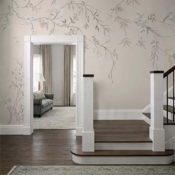 Fotobehang Bloemtakken met vogels op een lichte achtergrond N° w05127v7