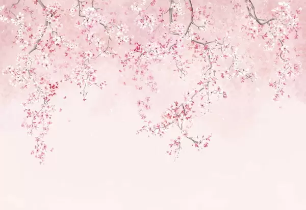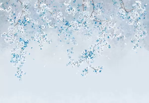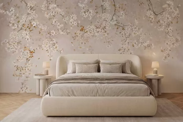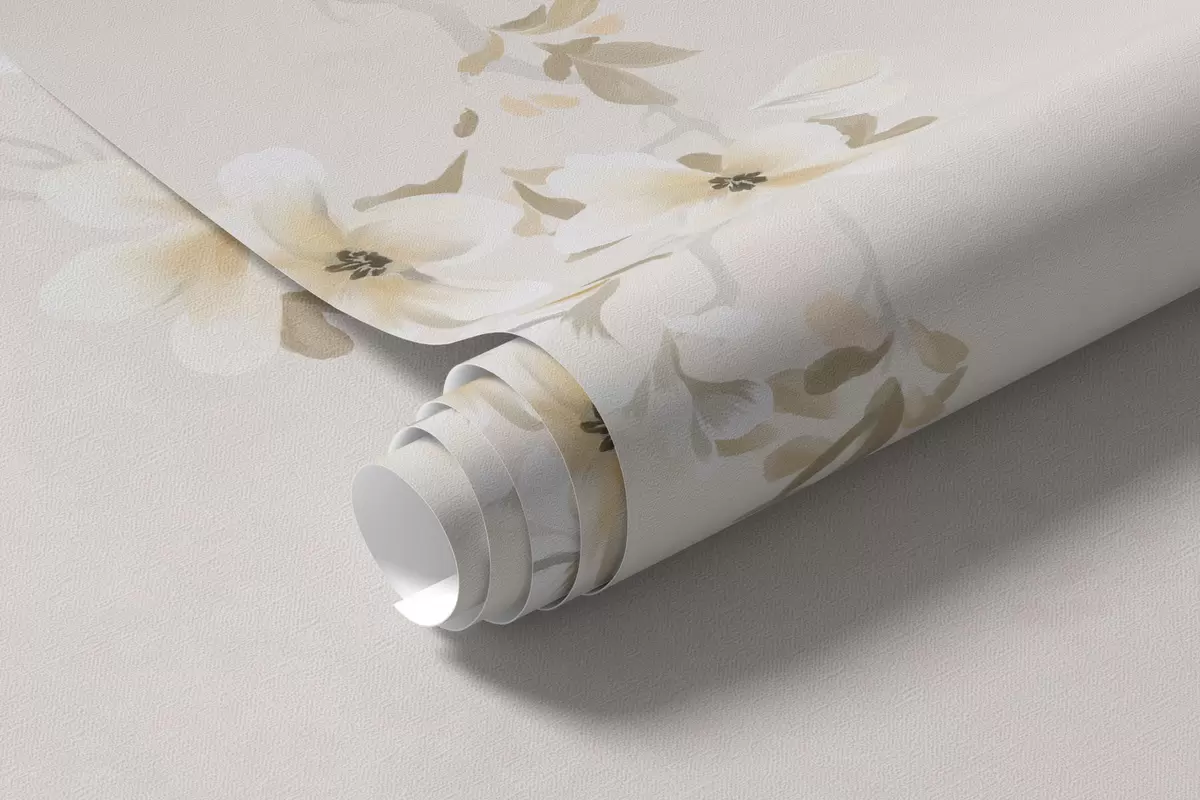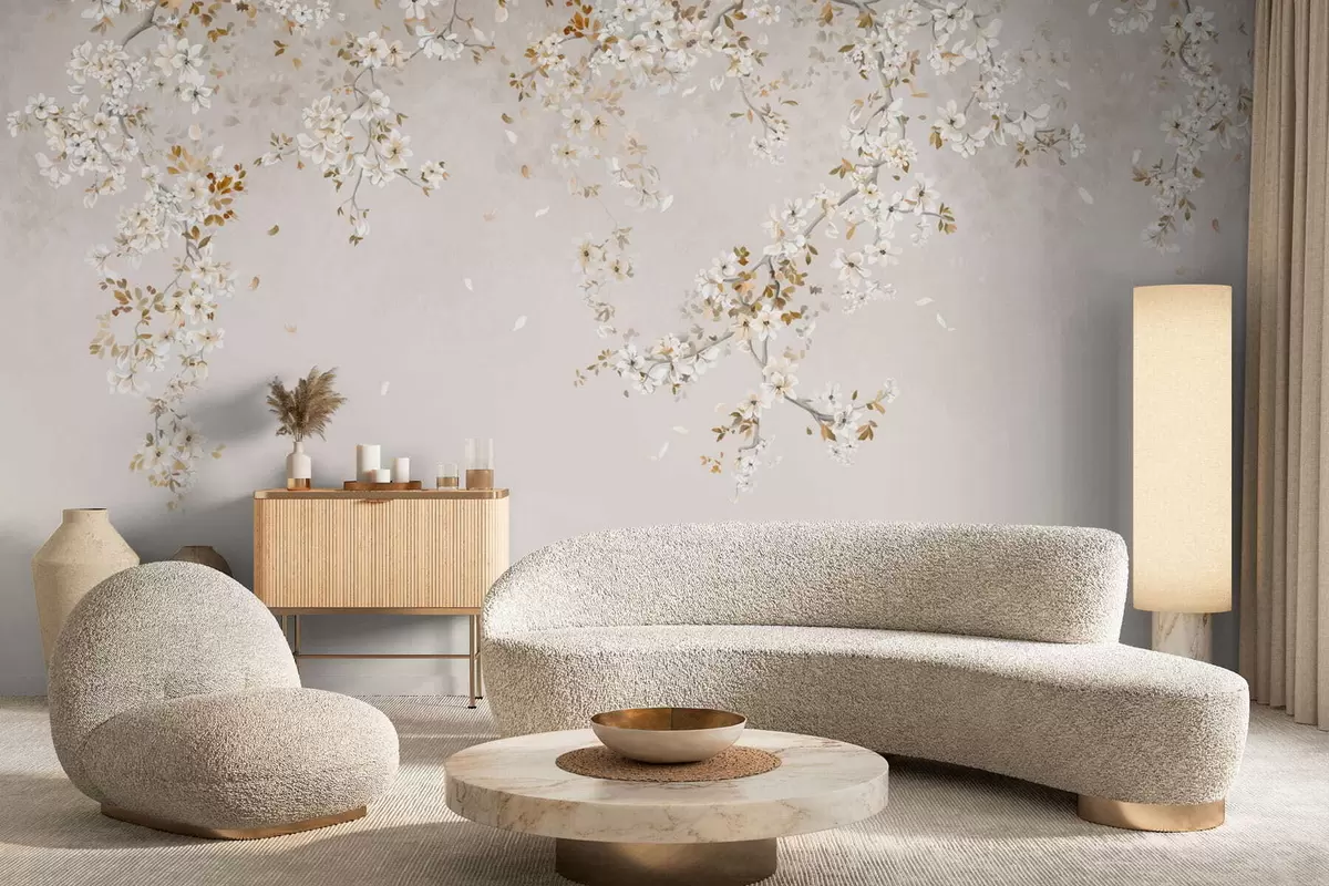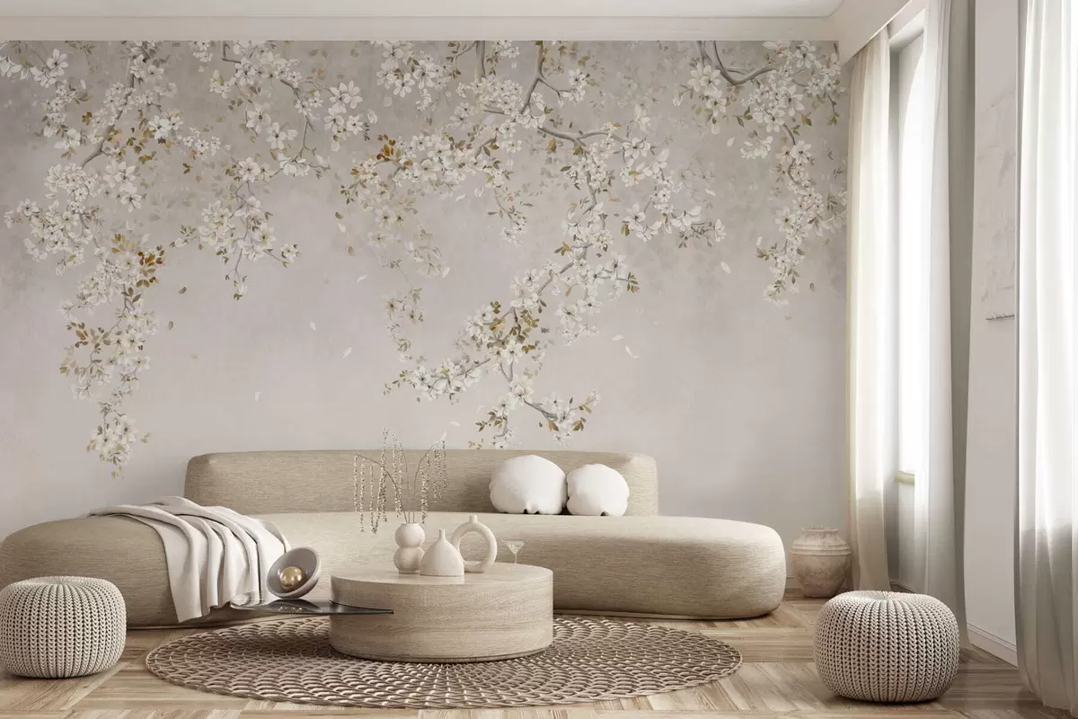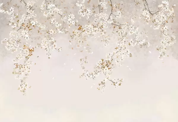 Fotobehang Takken met witte bloesems op een zachte beige achtergrond N° w05129