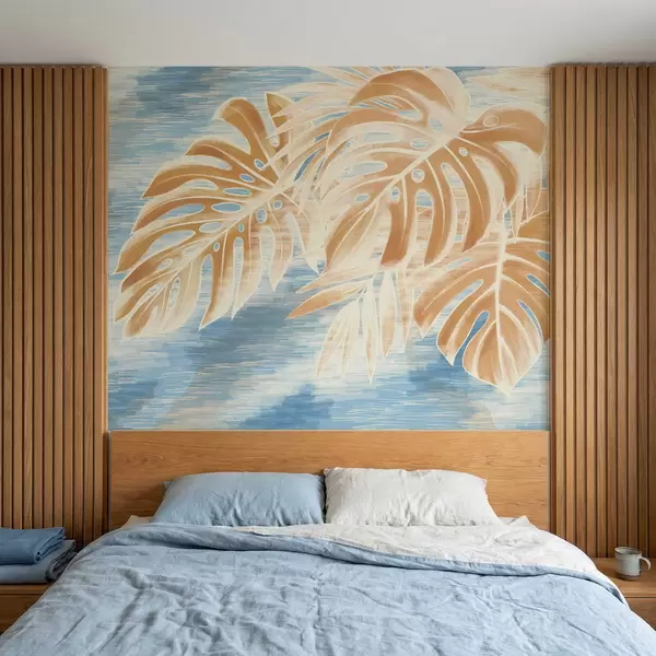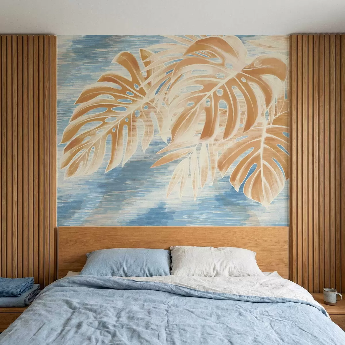 Fotobehang Bladeren in lichte zandtinten op een blauwe achtergrond N° w05130v1