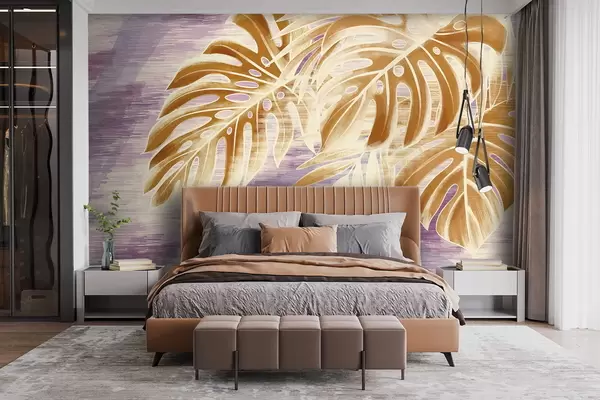 Fotobehang Bladeren in warme oranje tinten op een paarse achtergrond N° w05130v2