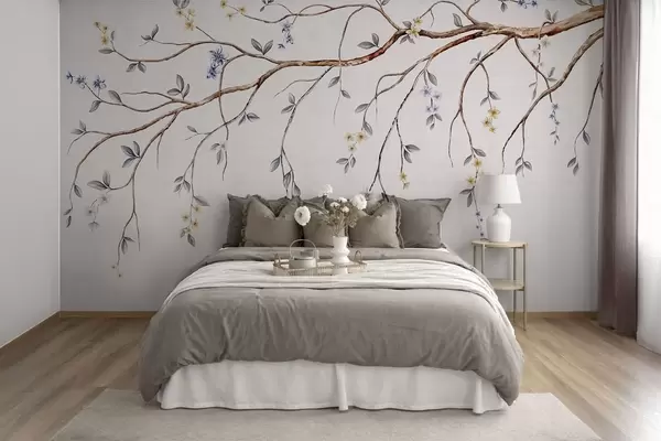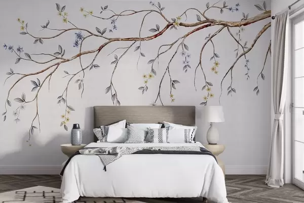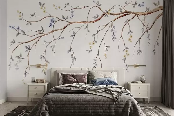 Fotobehang Dunne takken met kleine bloemen op een lichte achtergrond N° w05145