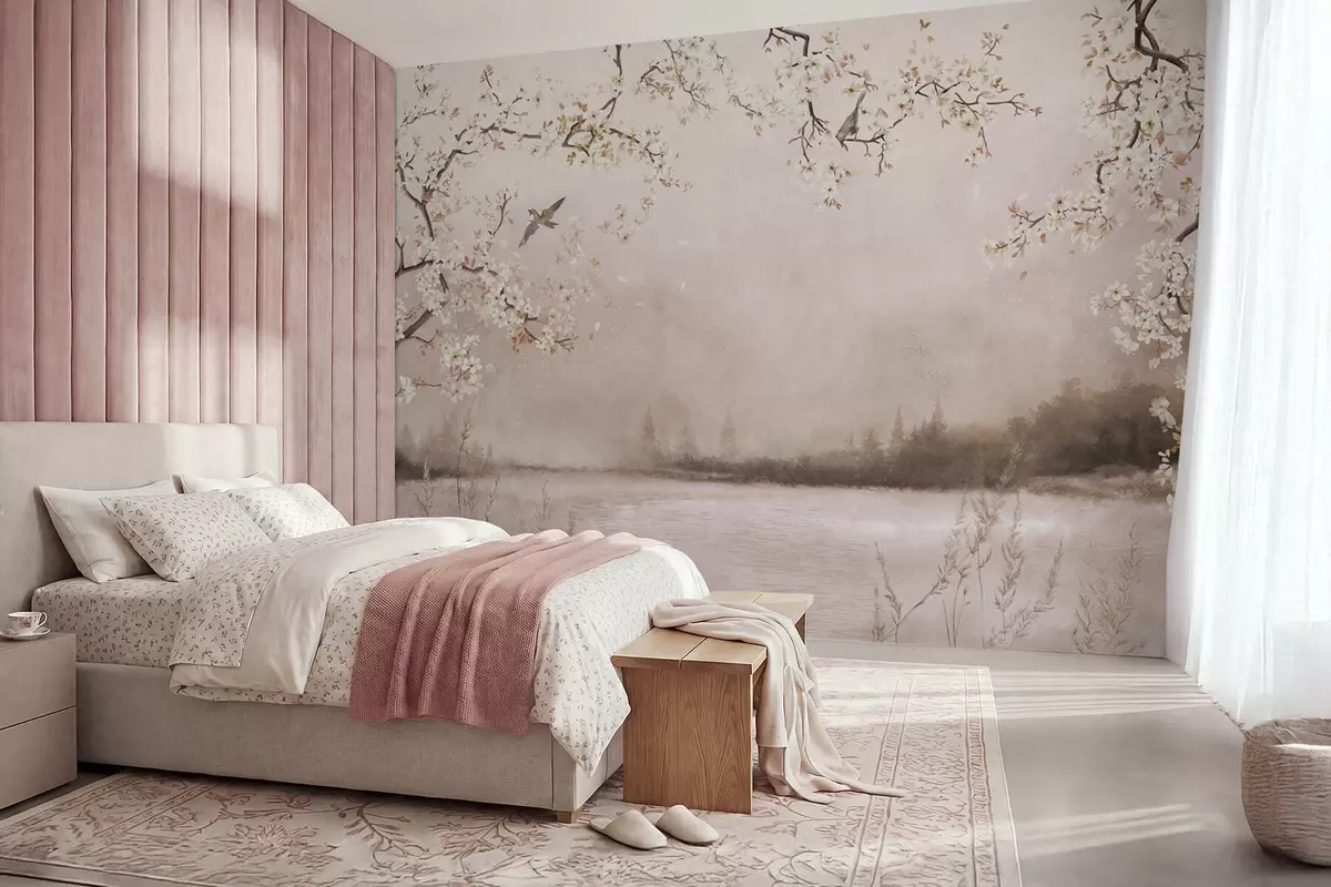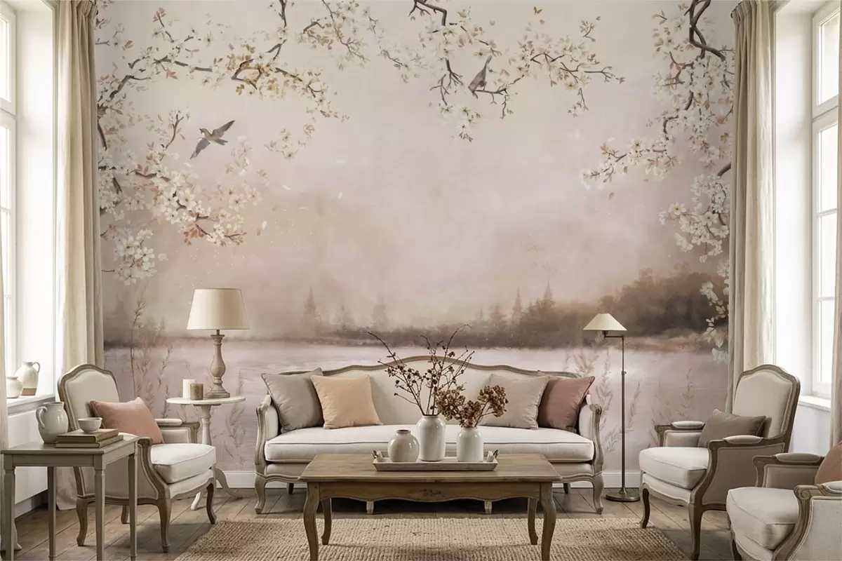 Fotobehang Bloeiende takken boven een rustig meer met vogels in de mist N° w05155v1