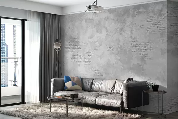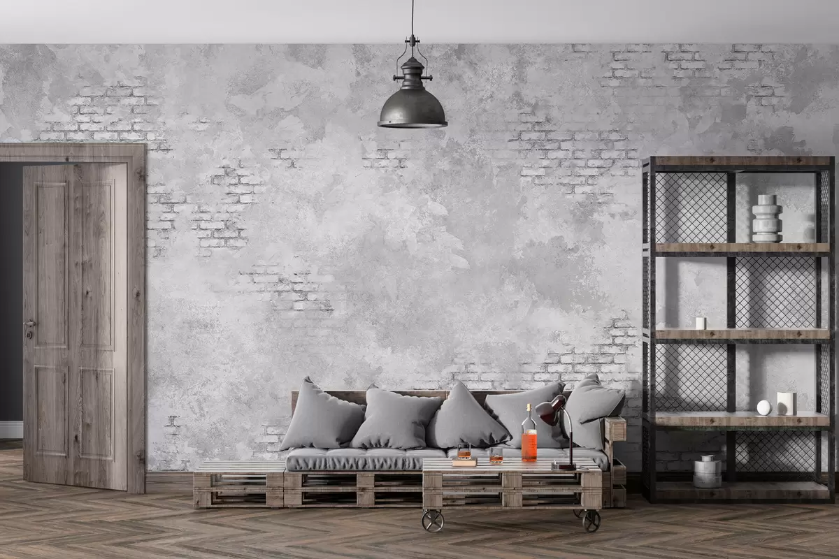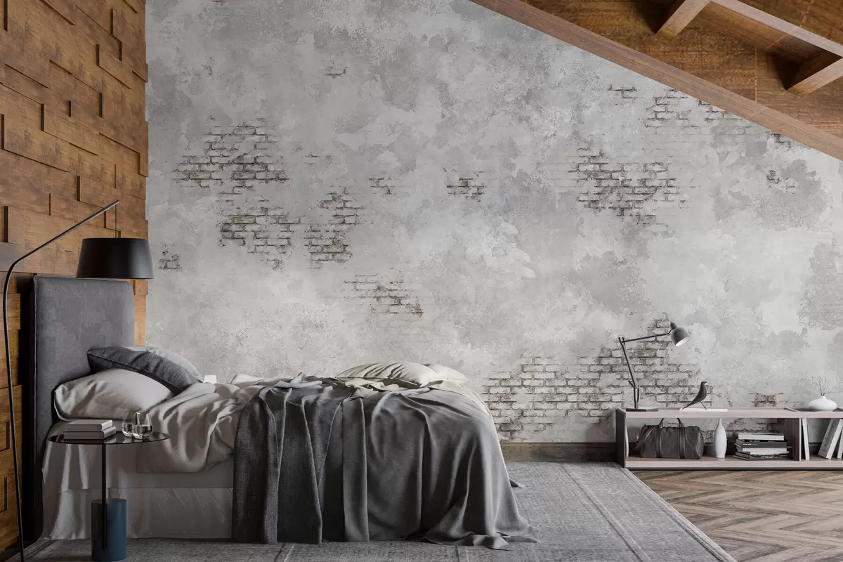 Fotobehang Grungegrijs pleisterwerk met stukken zichtbare baksteen N° w05161v2