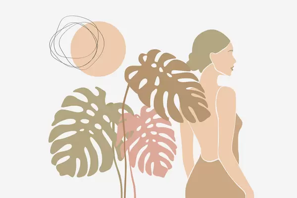 Fotobehang Silhouet van een vrouw naast tropische bladeren N° w05192
