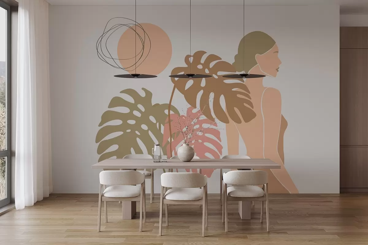 Fotobehang Silhouet van een vrouw naast tropische bladeren N° w05192v1