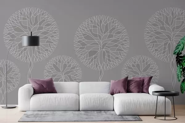 Fotobehang Fantastische lineaire bomen met weelderige kronen in middengrijze tinten N° w05213v5
