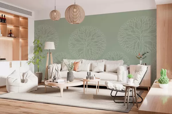Fotobehang Fantastische lineaire bomen met weelderige kronen in lichtgroene tinten N° w05213v6