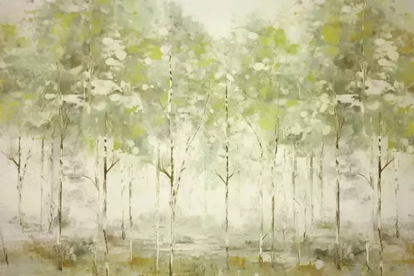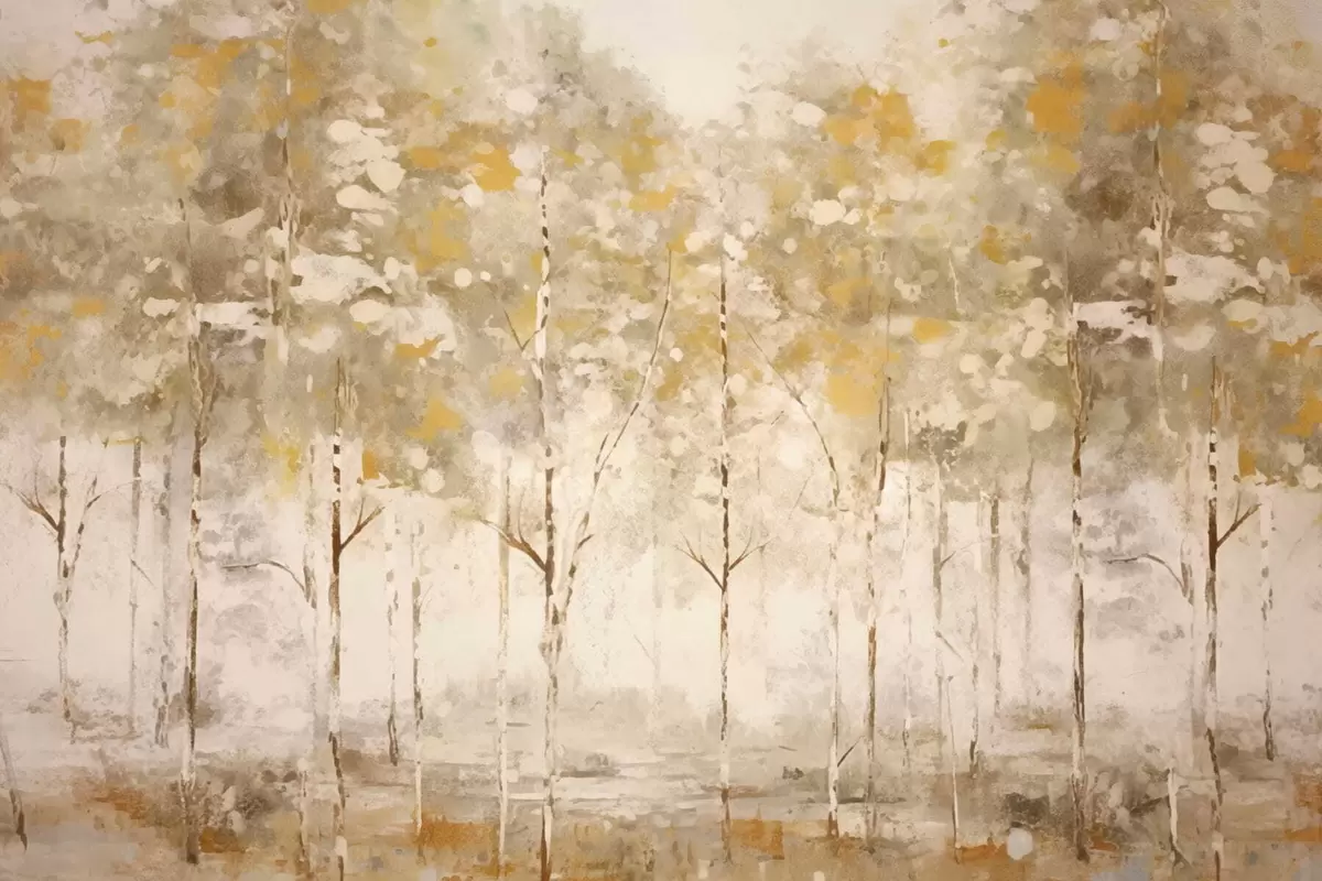 Fotobehang Gestileerd bos met slanke bomen in warme tinten N° w05221