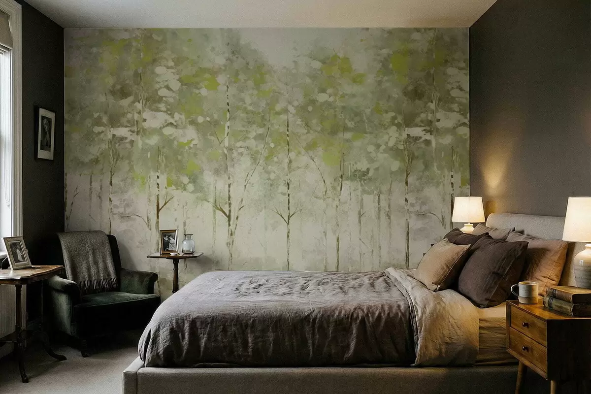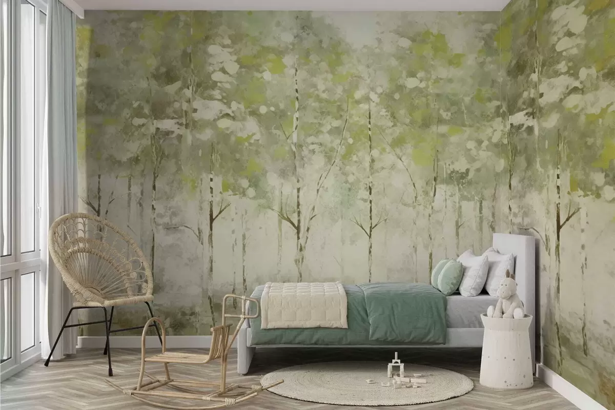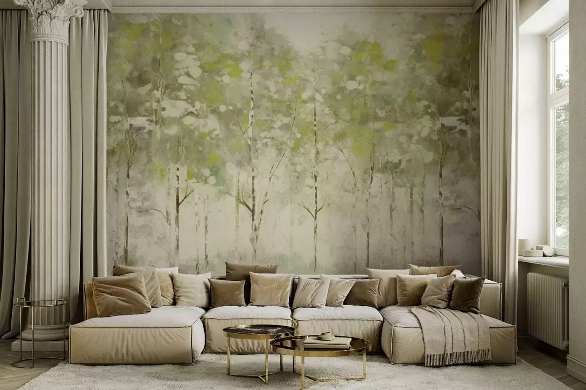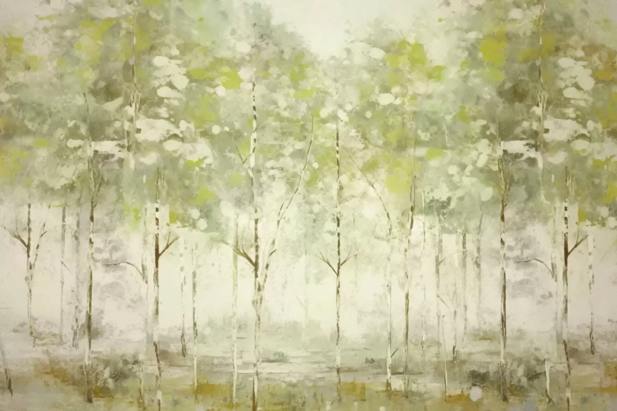 Fotobehang Gestileerd bos met slanke bomen in groene tinten N° w05221v1