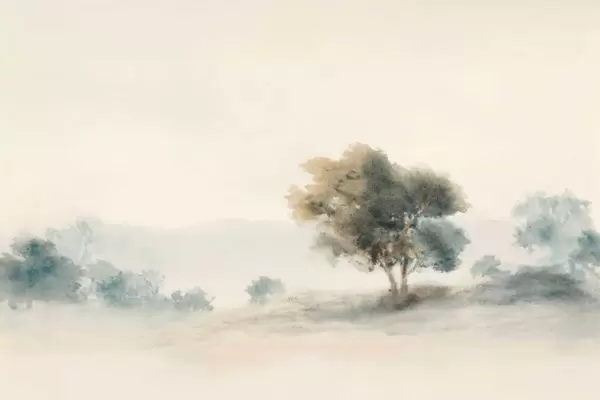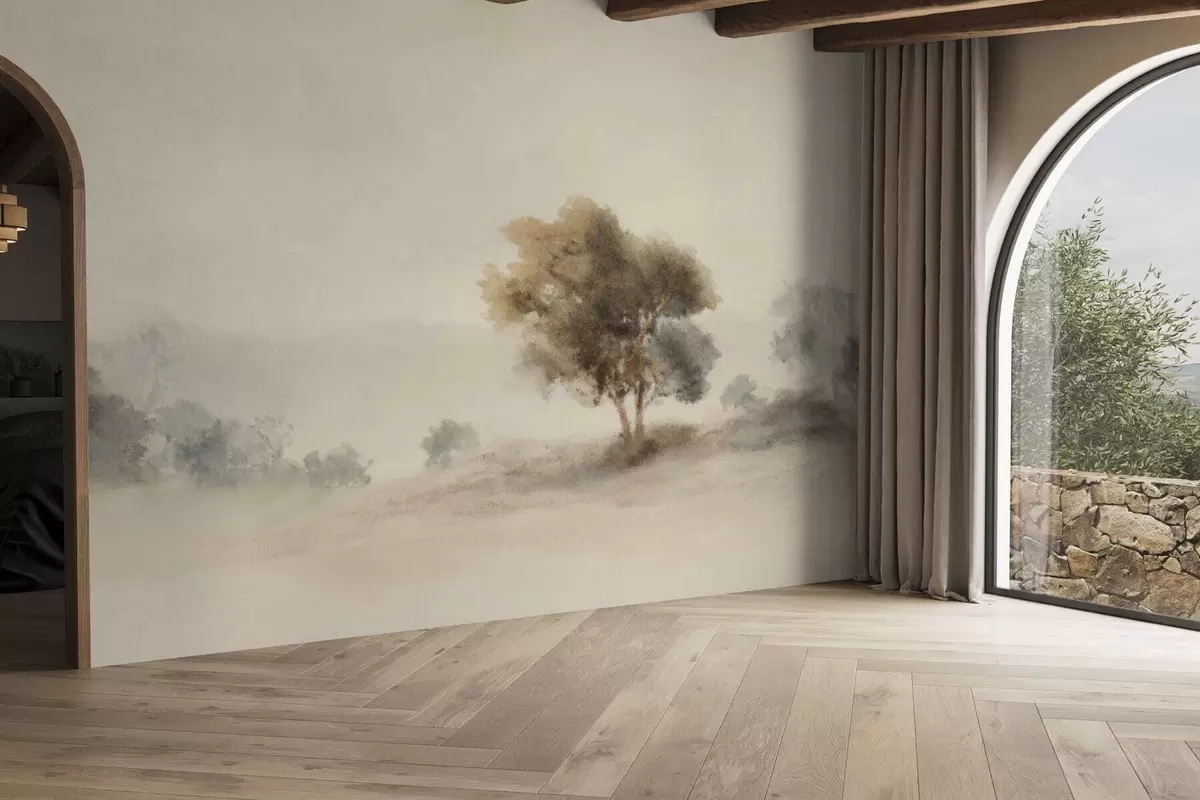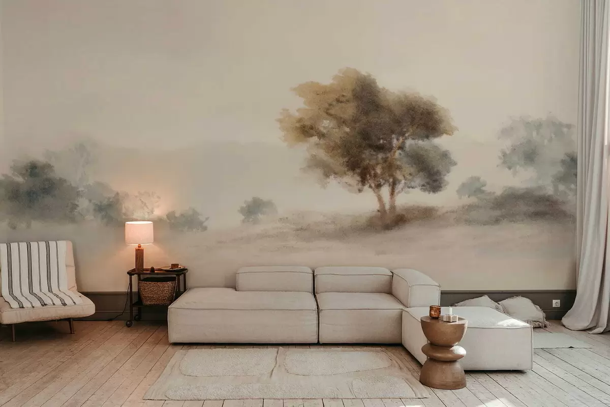 Fotobehang Minimalistisch landschap met een eenzame boom in de mist N° w05223