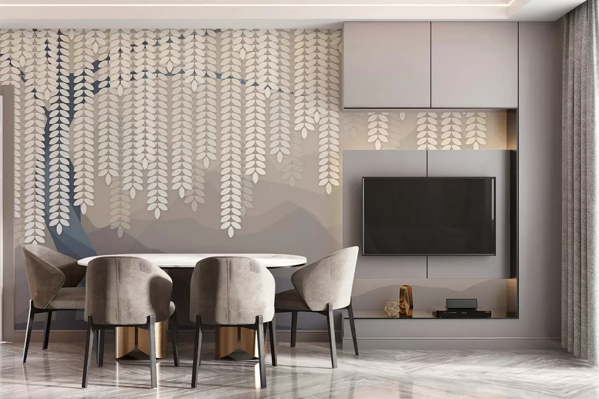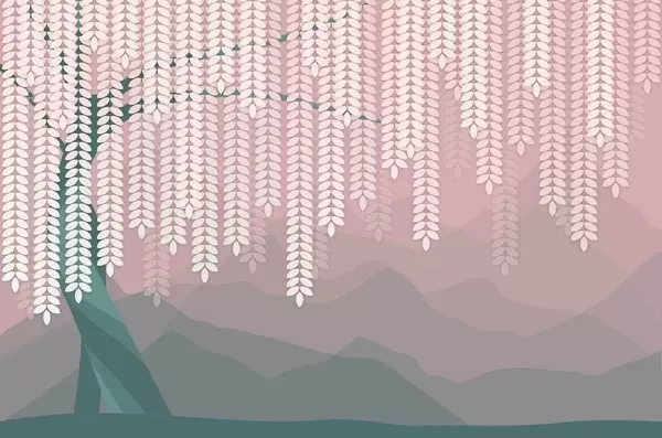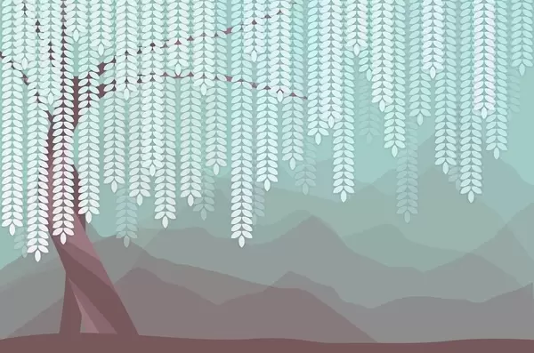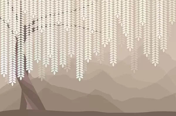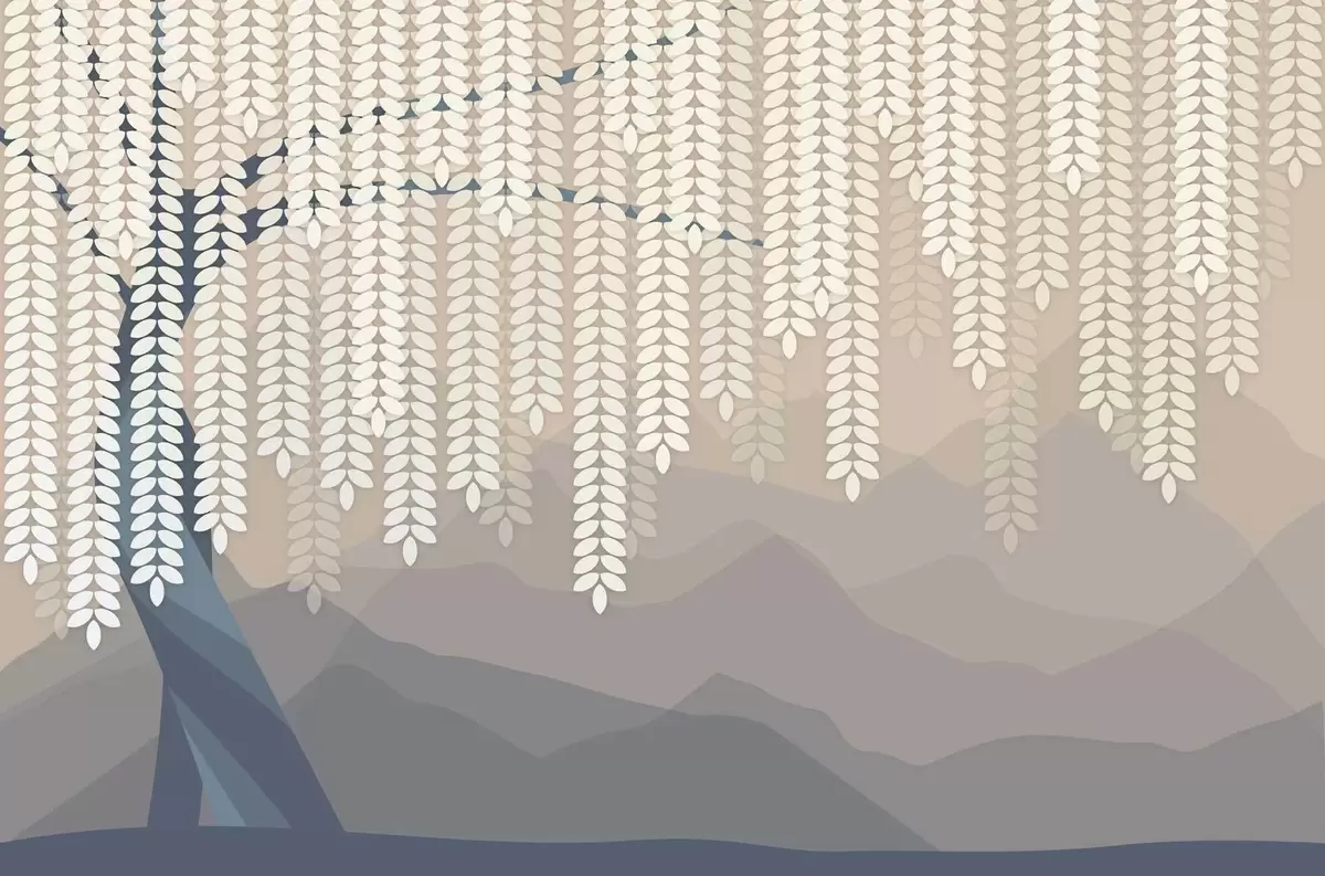 Fotobehang gestileerde wilg met hangende bladeren tegen een achtergrond van minimalistische bergen in beige en blauwgroene tinten N° w05232