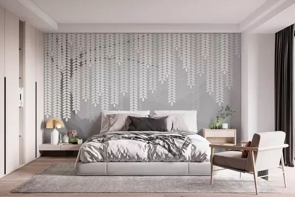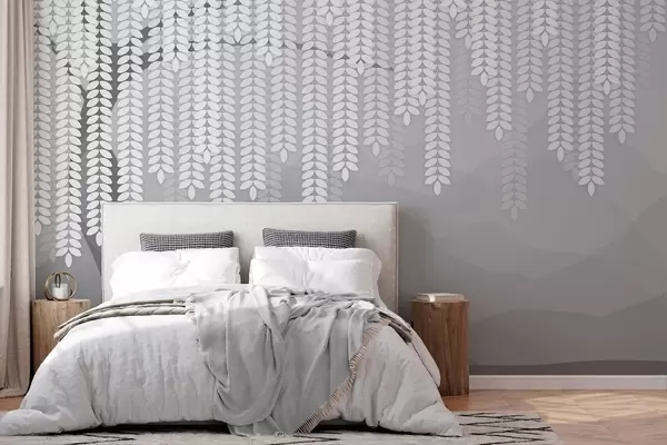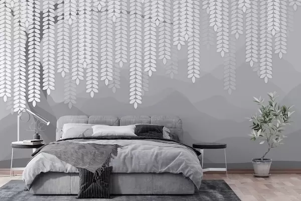 Fotobehang Gestileerde wilg met hangende bladeren tegen een achtergrond van minimalistische bergen in grijstinten. N° w05232v3