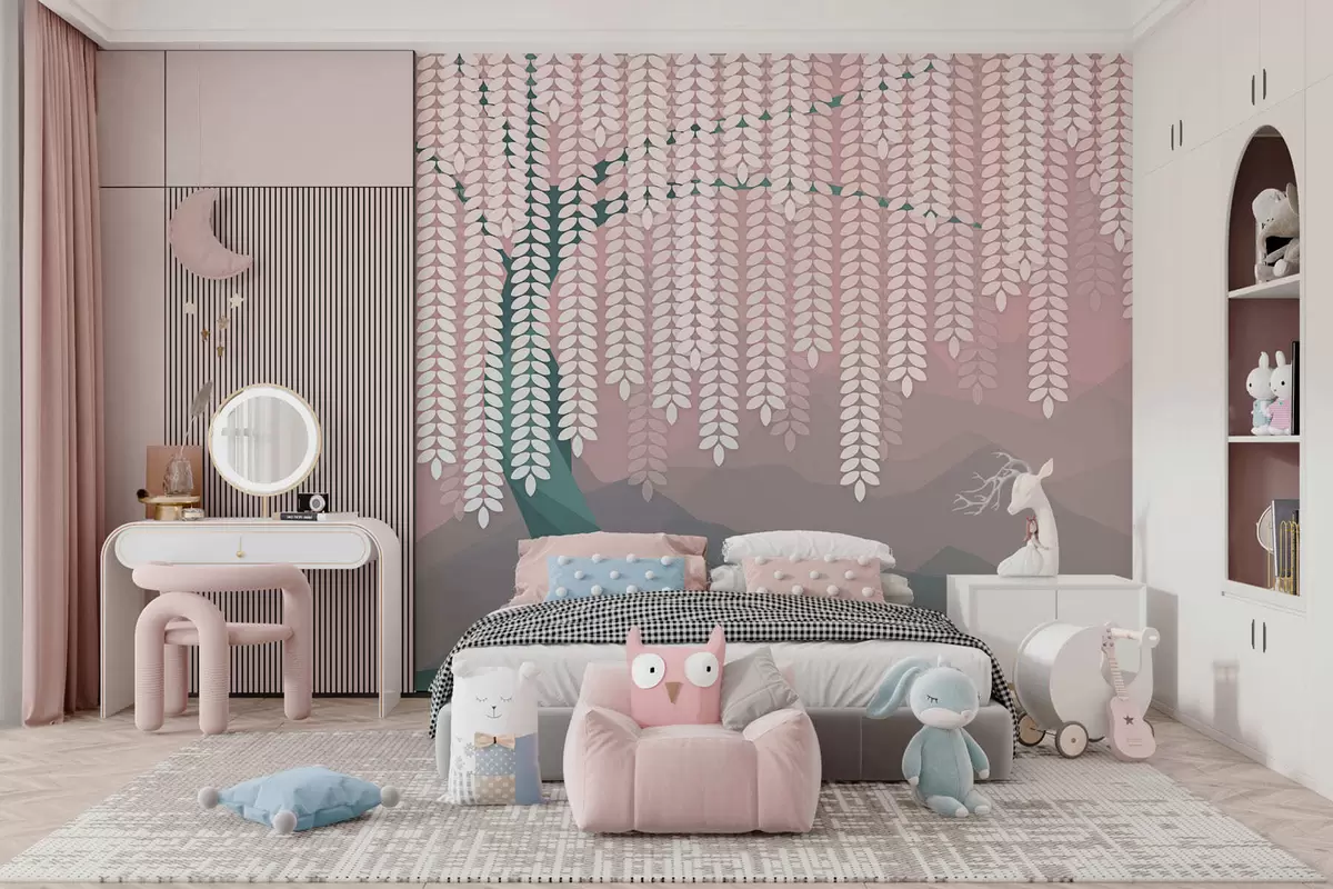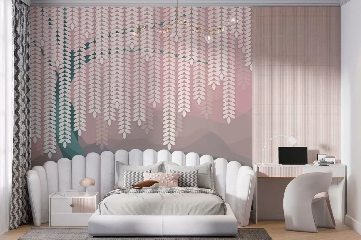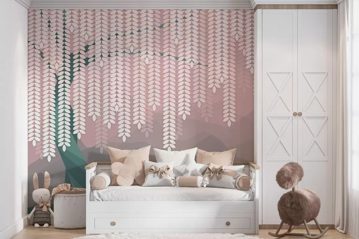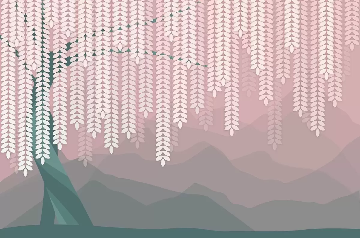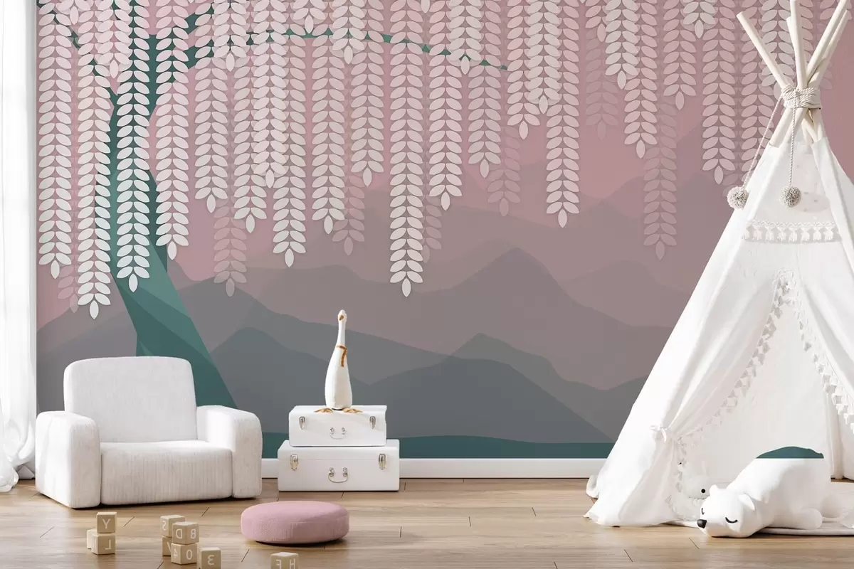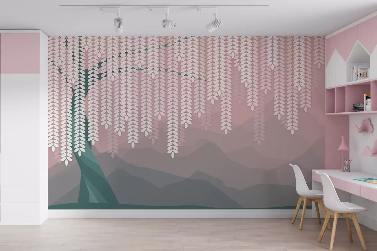 Fotobehang Gestileerde wilg met hangende bladeren tegen een achtergrond van minimalistische bergen in roze en donkergroene tinten. N° w05232v4