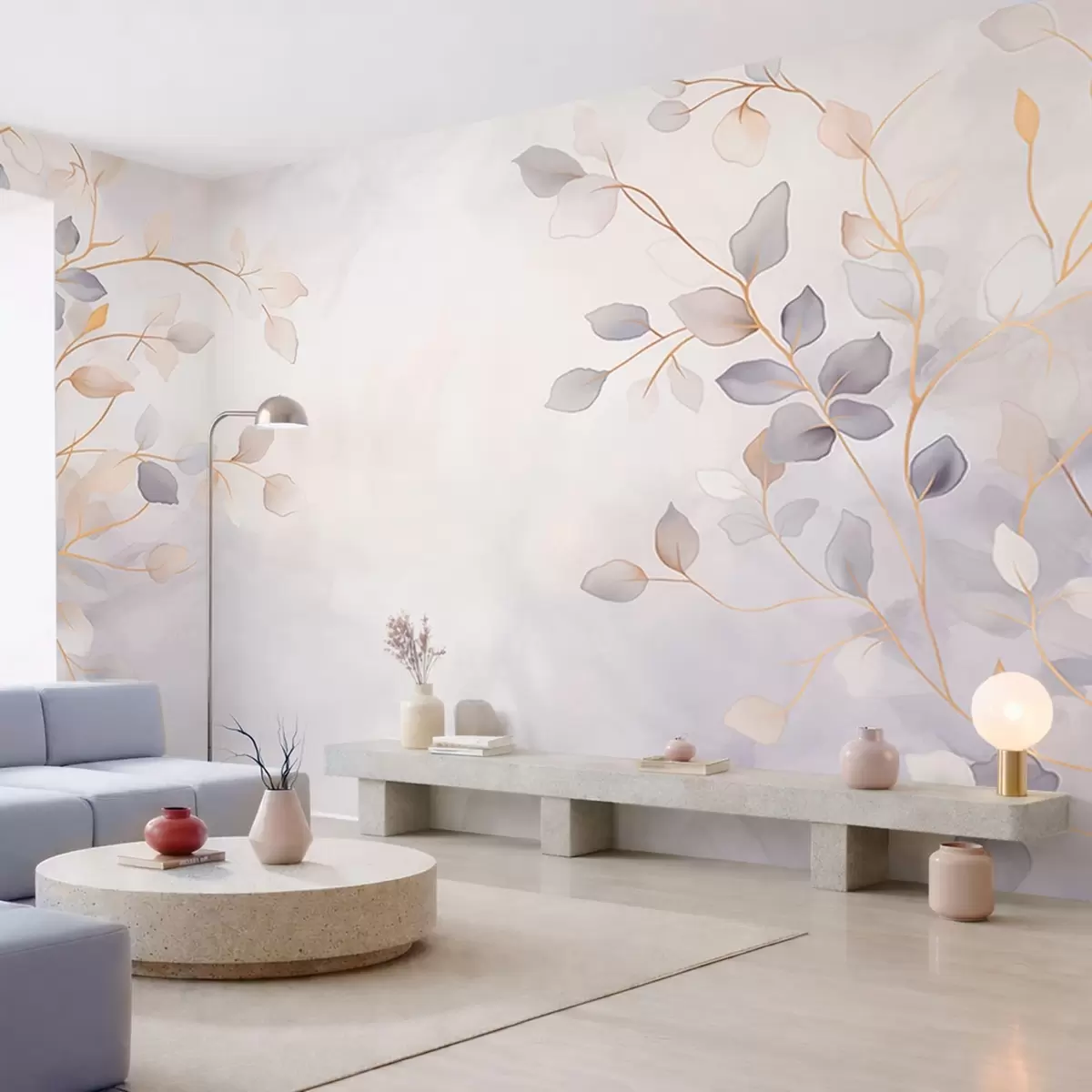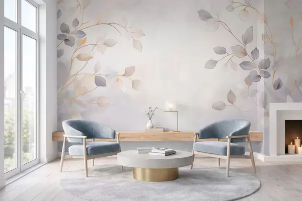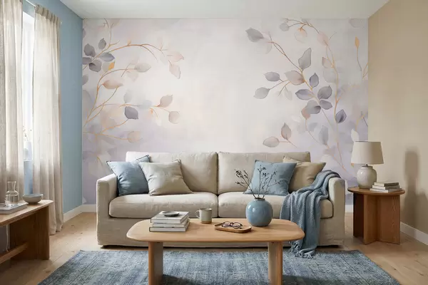 Fotobehang Fijne, bladrijke takken tegen een zacht, wazige achtergrond N° w05296