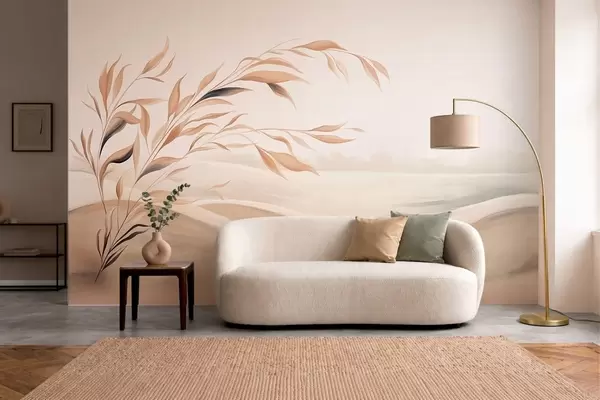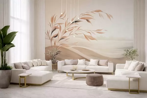 Fotobehang Een zacht landschap met een tak boven heuvels in lichtbeige tinten N° w05297