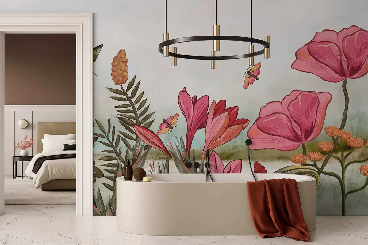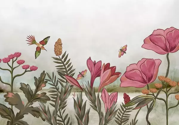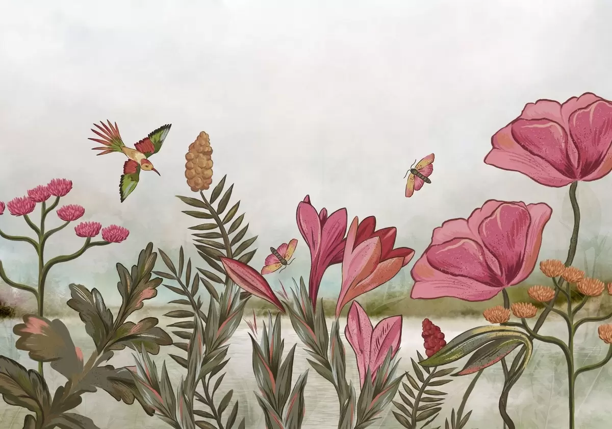 Fotobehang Heldere bloemen met vogels en vlinders N° w05321
