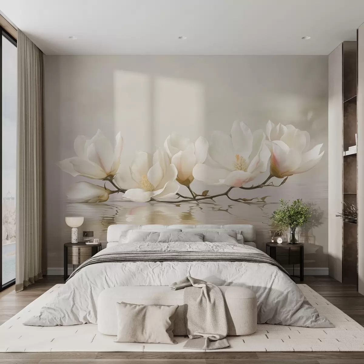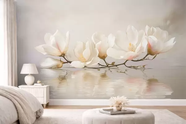 Fotobehang Lichte magnoliabloesems op tak boven waterreflectie N° w05353