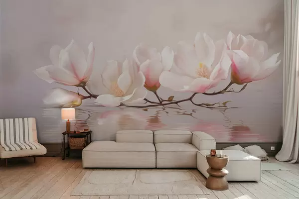 Fotobehang Magnoliatak met bloesems boven een rustige waterreflectie N° w05353v1