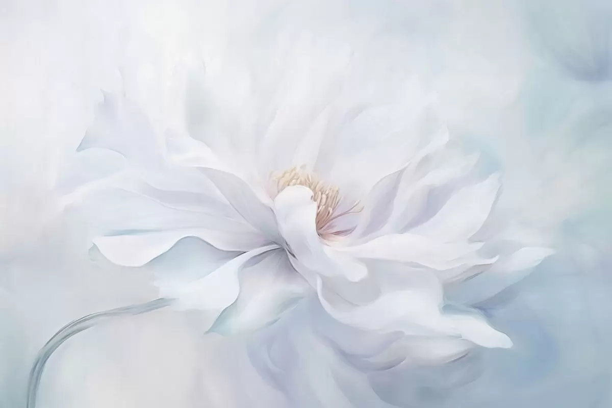 Fotobehang Zachte witte bloem met golvende bloemblaadjes op een blauwe achtergrond N° w05354
