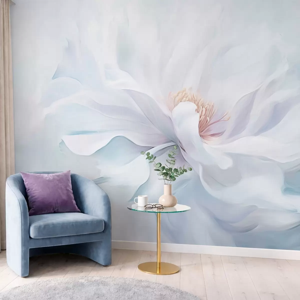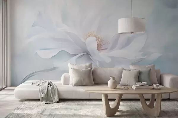 Fotobehang Zachte witte bloem met golvende bloemblaadjes op een blauwe achtergrond N° w05354