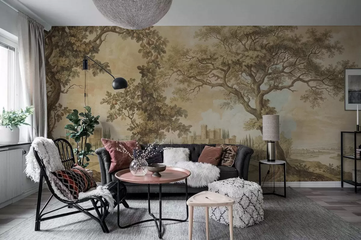 Fotobehang Pastorale landschap in geborduurde stijl N° w05359
