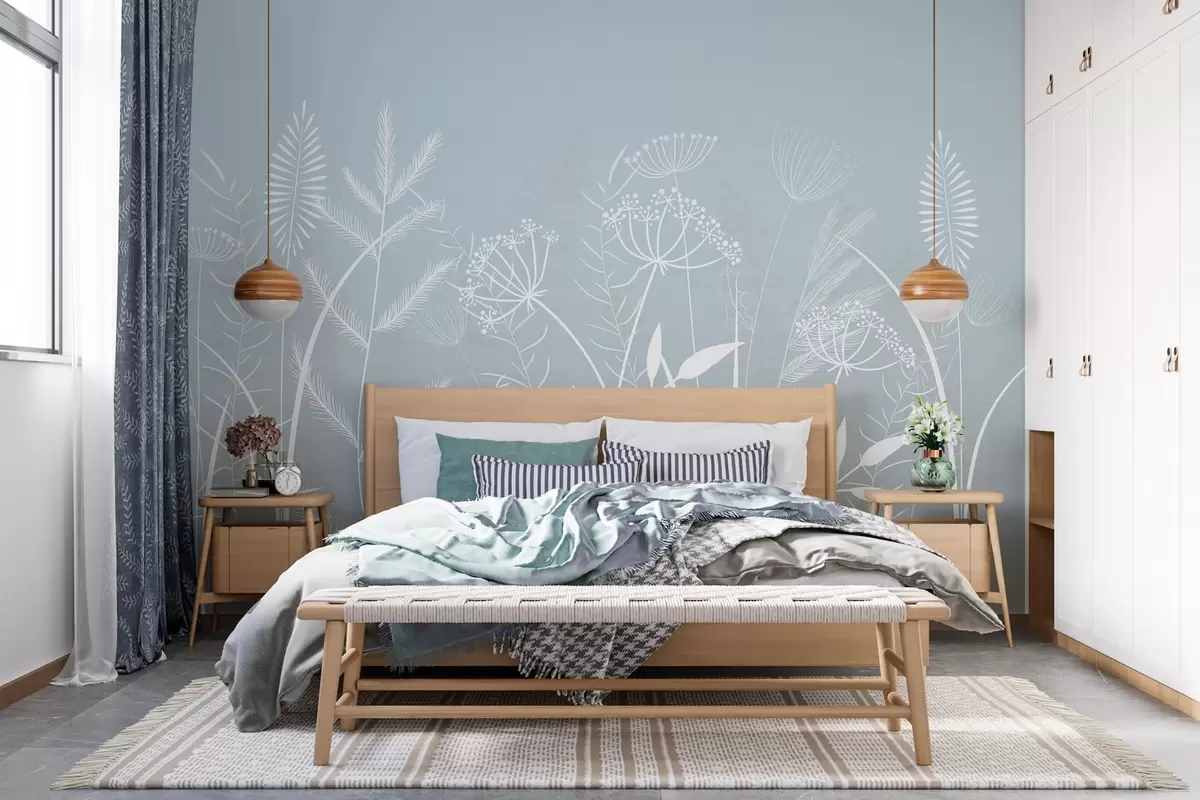Fotobehang fijne, met de hand geschilderde wilde grassen en bloemen tegen een grijsblauwe achtergrond N° w05383