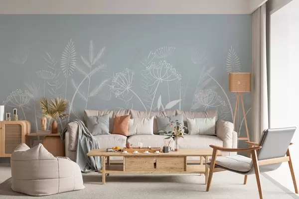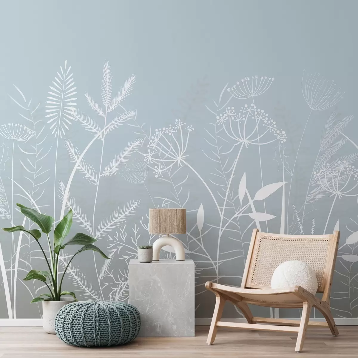 Fotobehang fijne, met de hand geschilderde wilde grassen en bloemen tegen een grijsblauwe achtergrond N° w05383
