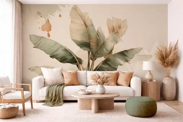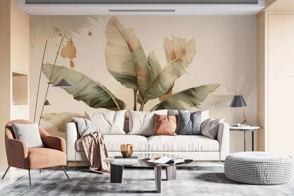 Fotobehang een grote, schilderachtige bos bananenbladeren met spatten in retrostijl N° w05384