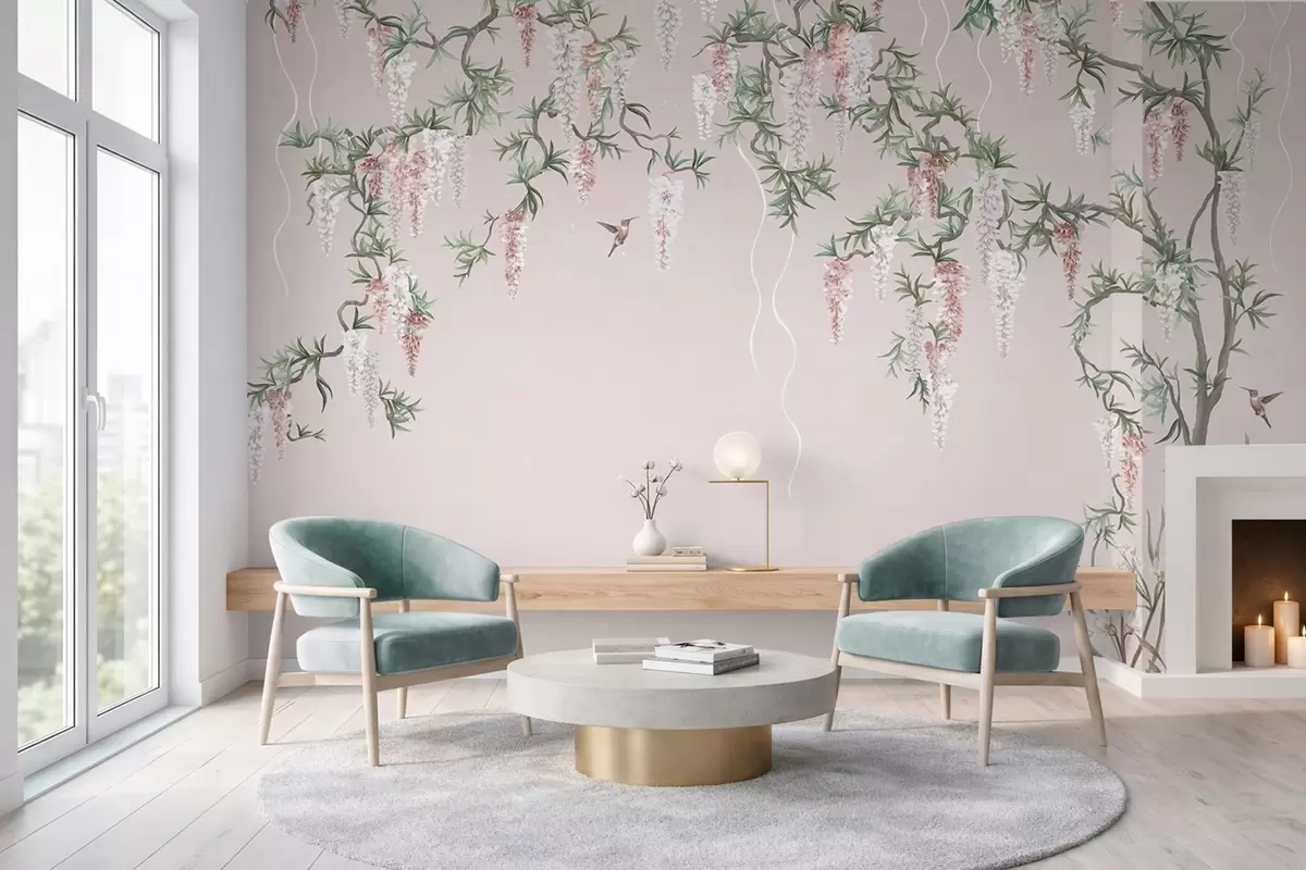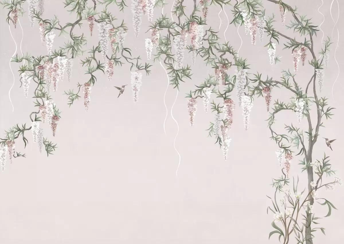 Fotobehang Bloeiende takken met roze bloesems en vogels N° w05394v1