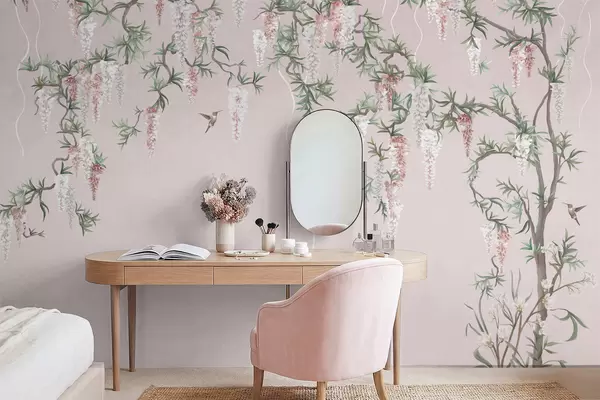 Fotobehang Bloeiende takken met roze bloesems en vogels N° w05394v1
