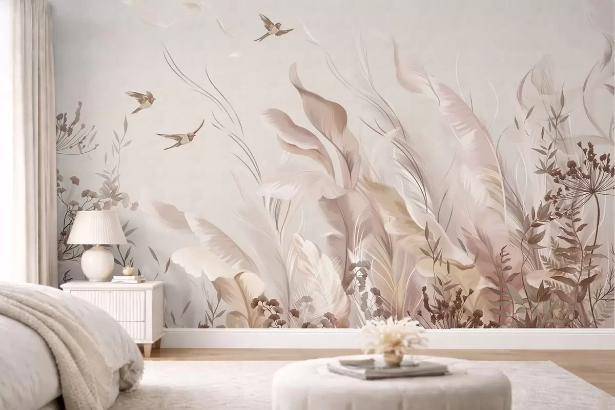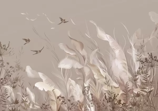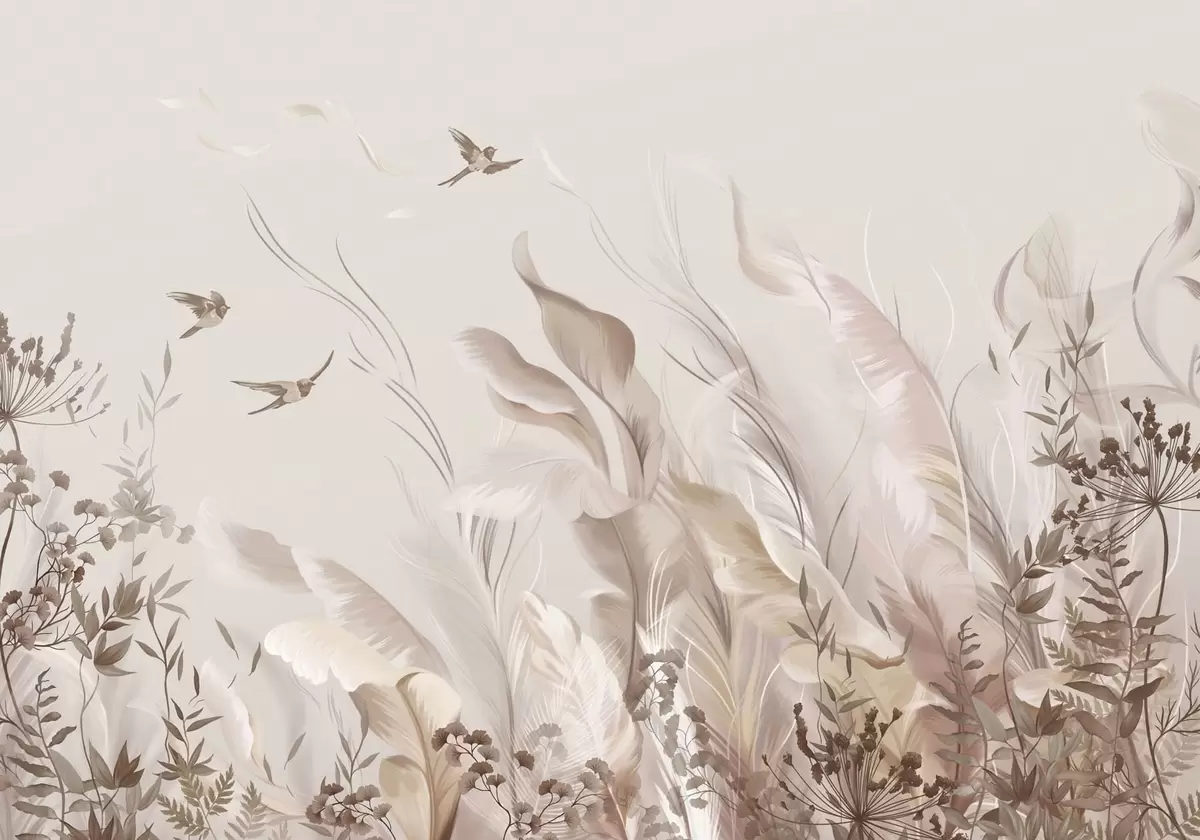 Fotobehang Zachte veren, grassen en vogels in lichte tinten N° w05395